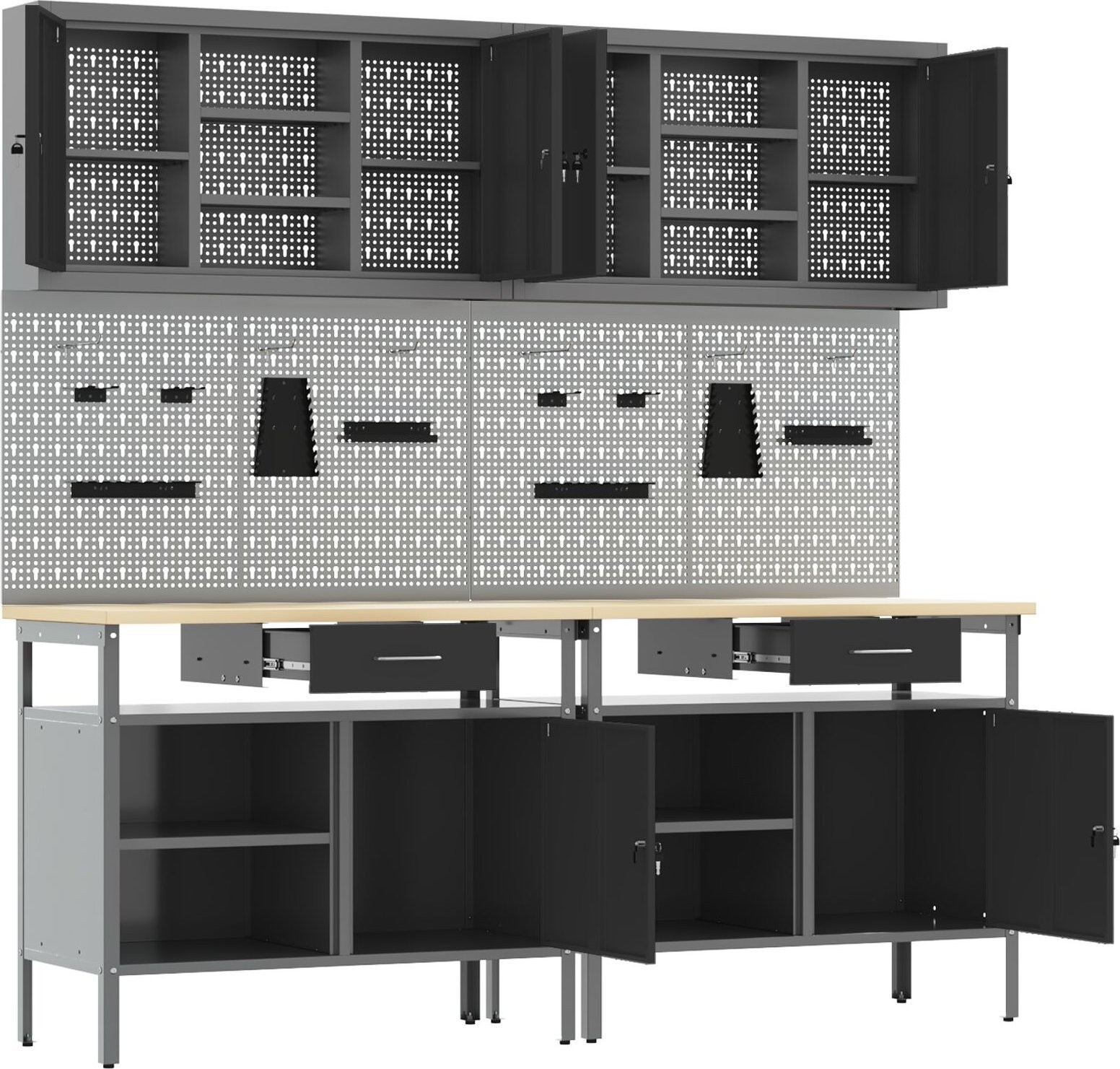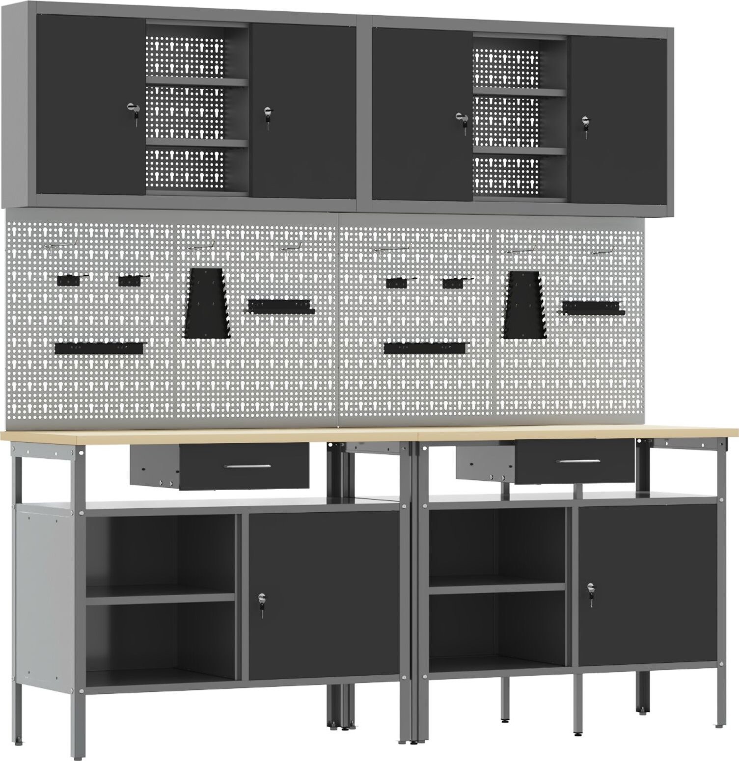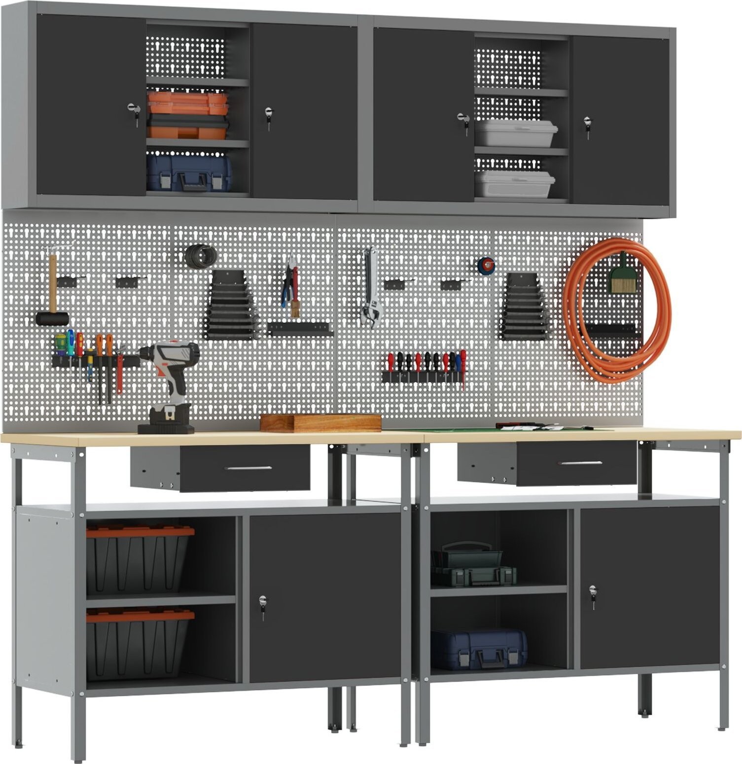 - Lieferumfang: Werkzeugtafel, Halterung, Haken, Schränke