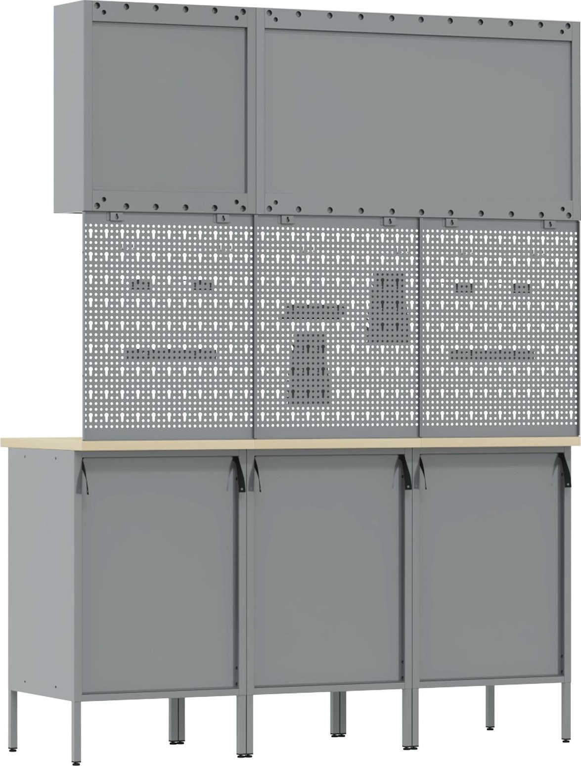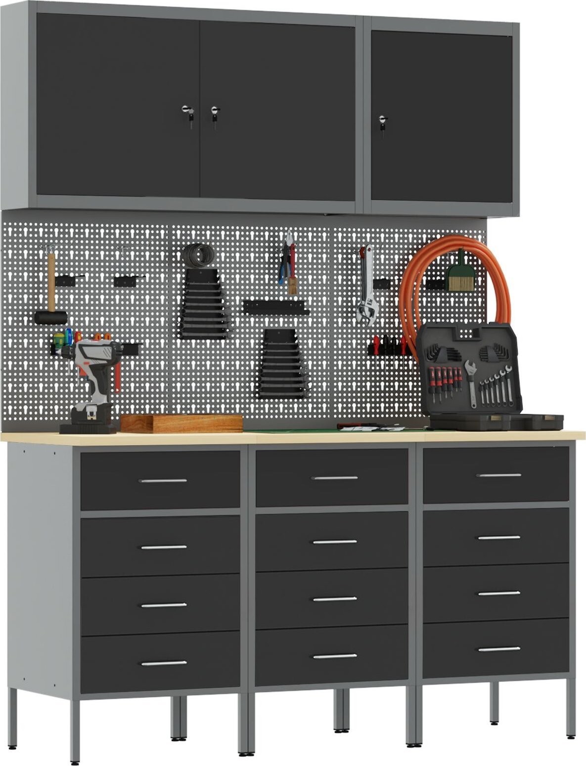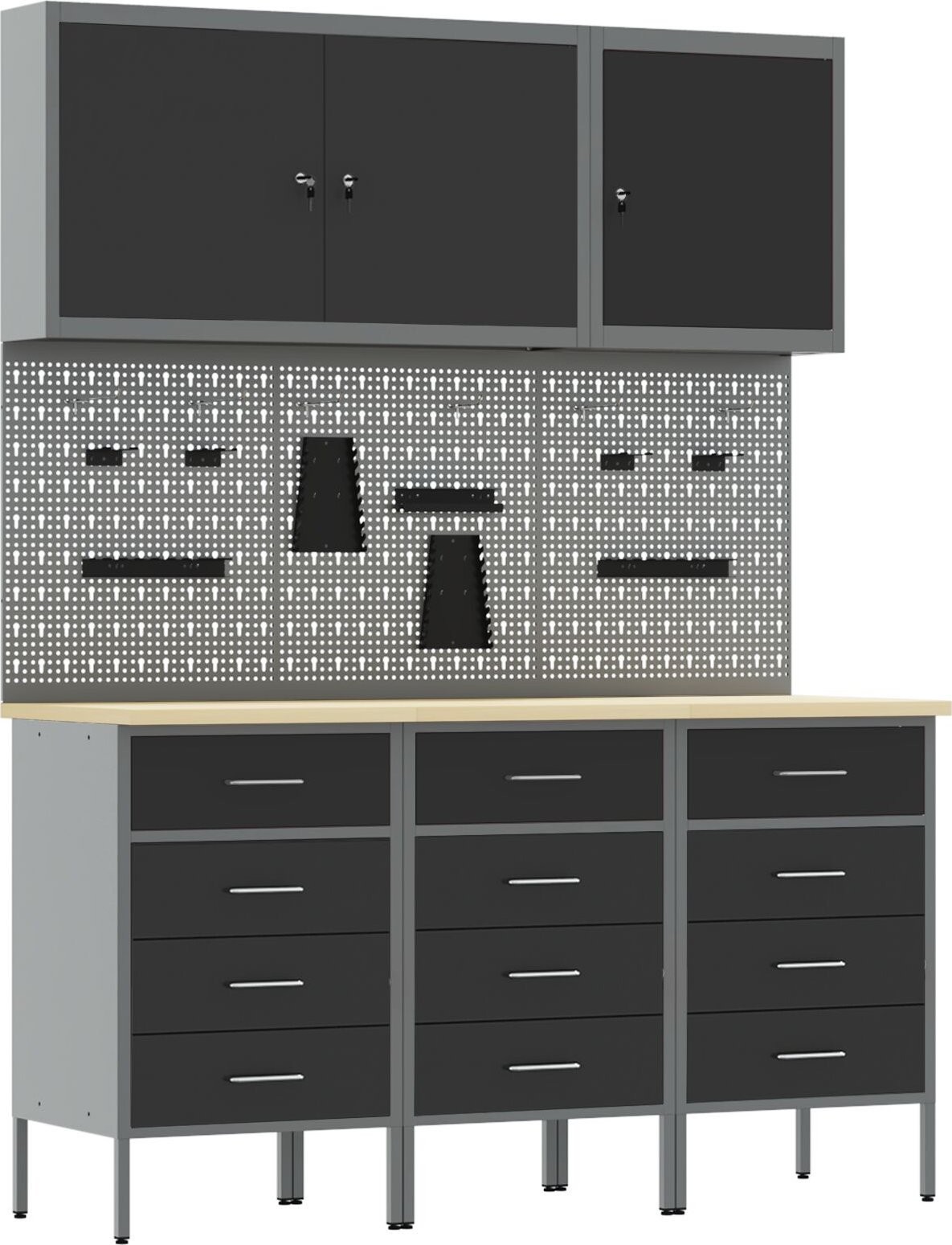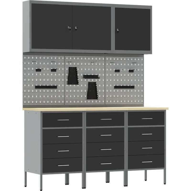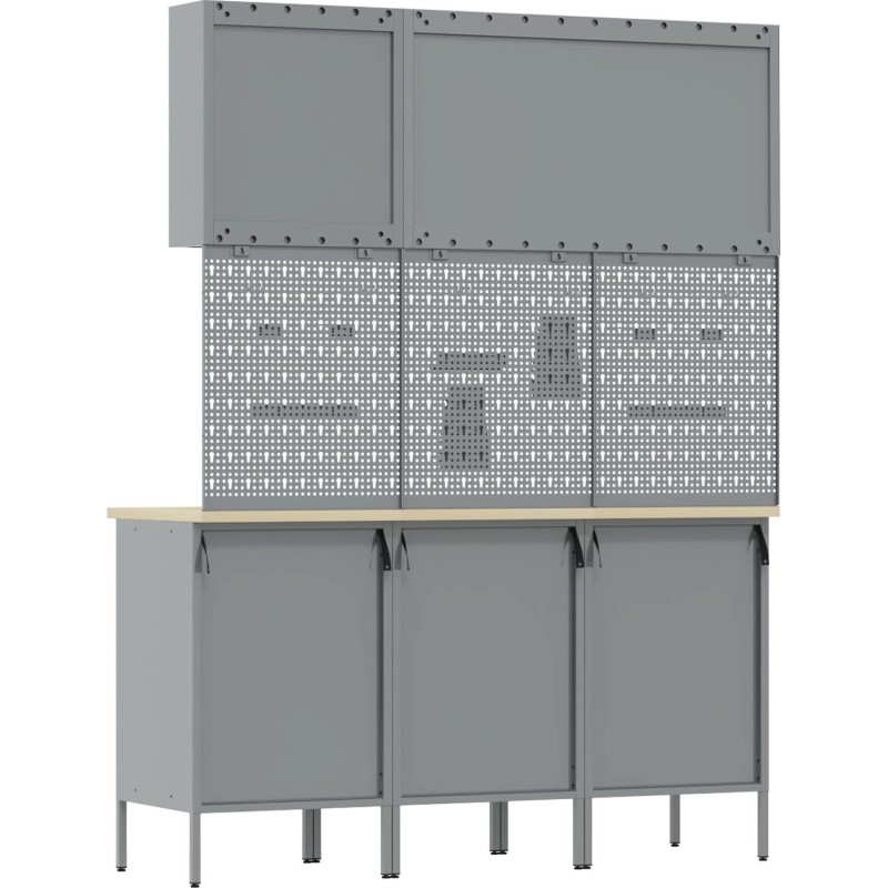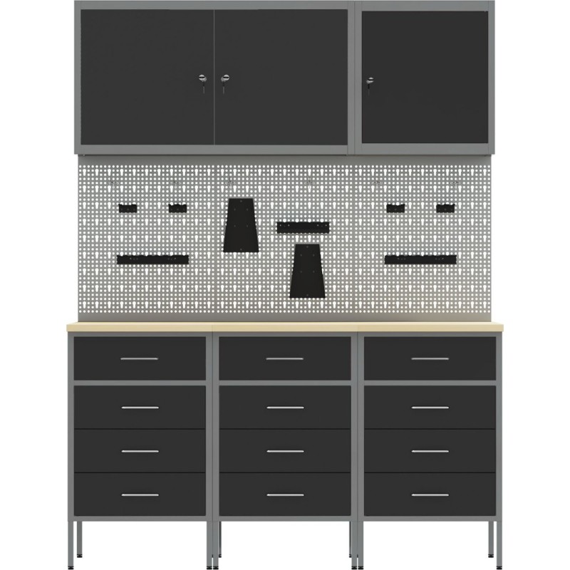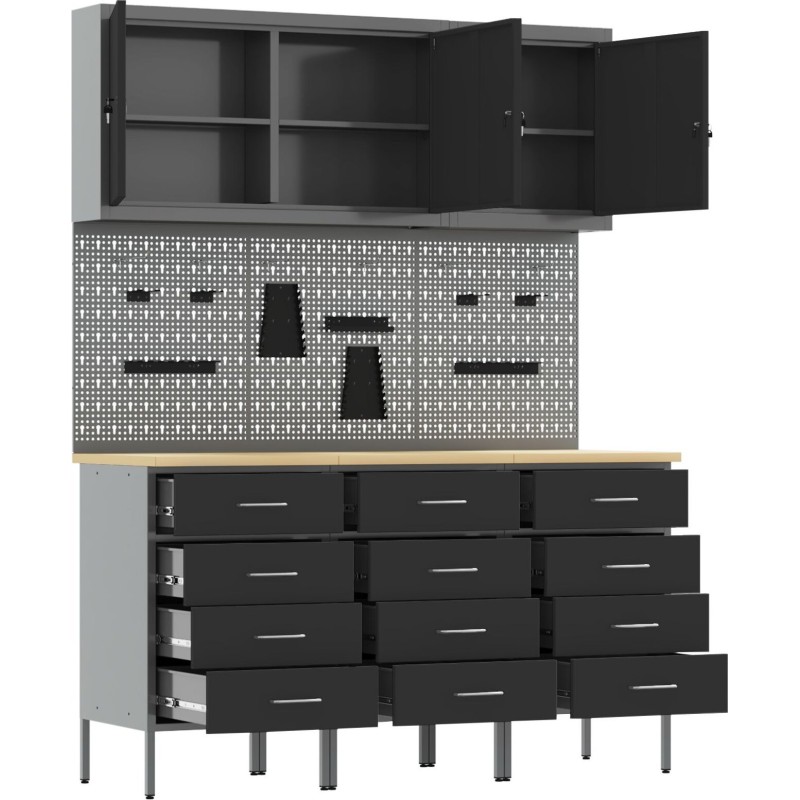 - Der Schrank hat eine maximale Tragkraft von 150 kg, was seine Langlebigkeit und Eignung für die Aufbewahrung sowohl schwerer Werkzeuge als auch kleinerer Zubehörteile unterstreicht.