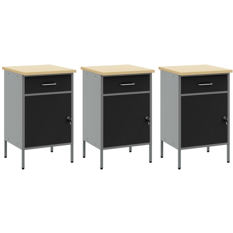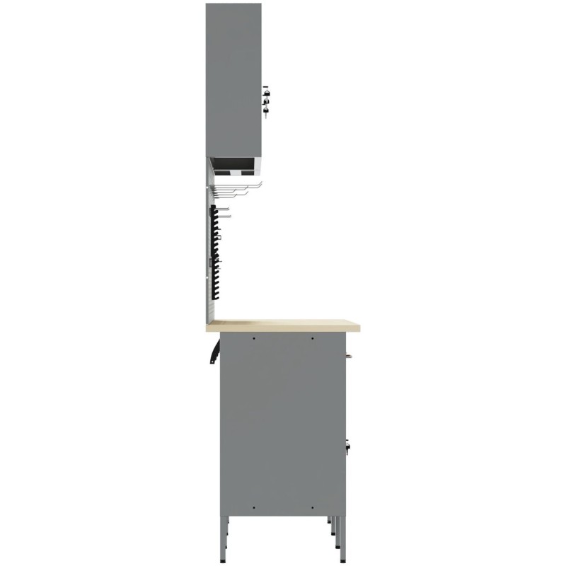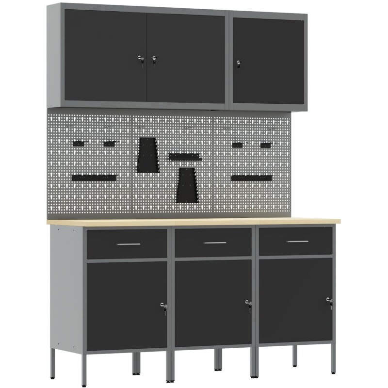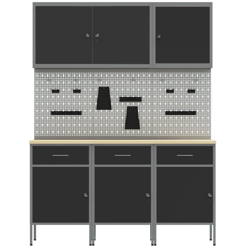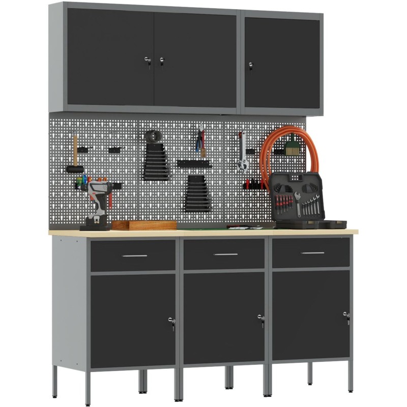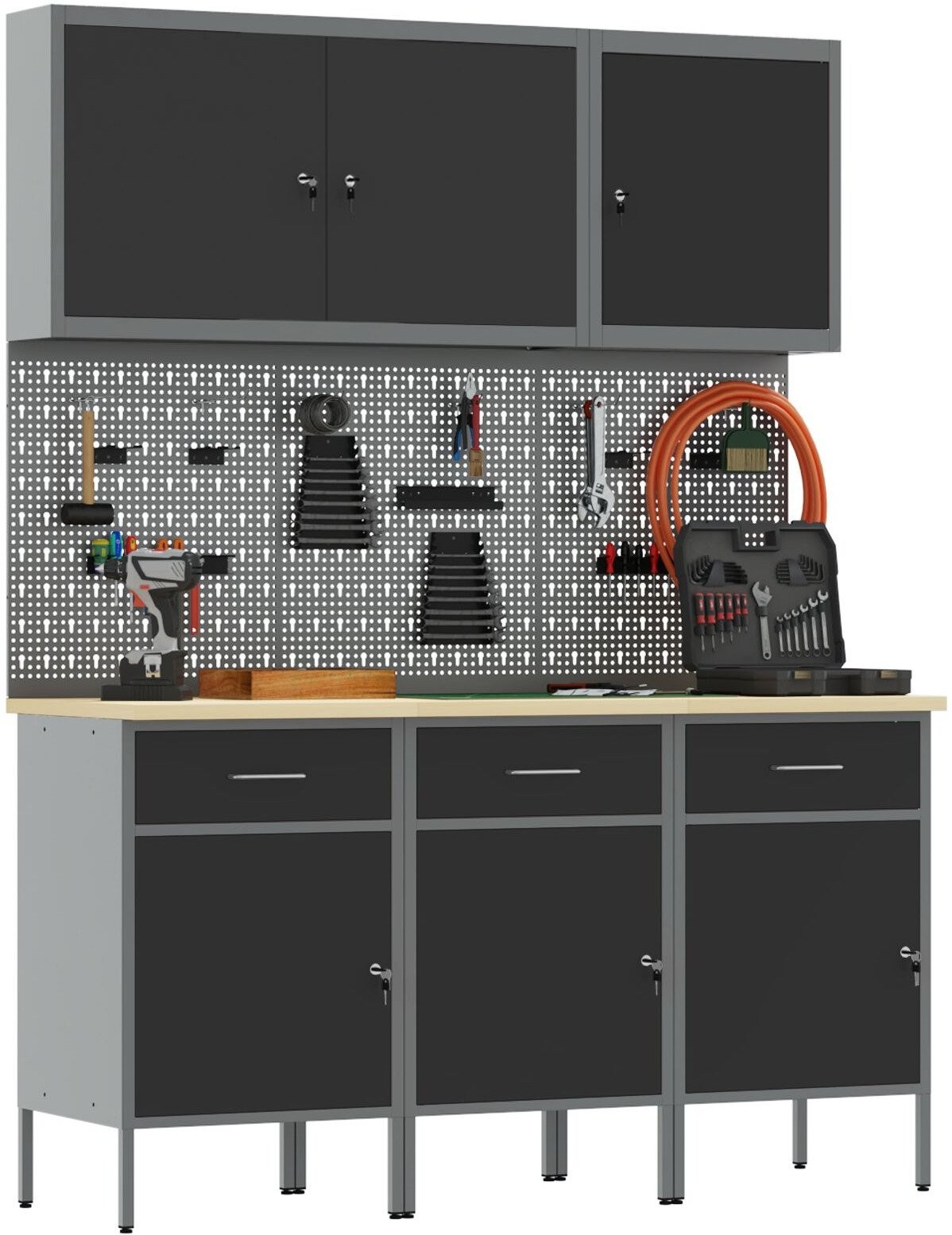 Dieser Arbeitsschrank aus Stahl ist praktisch und robust, was ihn zu einem unverzichtbaren Bestandteil jeder Werkstatt oder Garage macht. Mit seiner modernen Oberfläche in Schwarz und Grau sowie den Akzenten in Holzoptik an der Oberseite sieht er nicht nur gut aus, sondern bietet auch praktischen Stauraum für Werkzeug- und Heimwerkerfreunde.