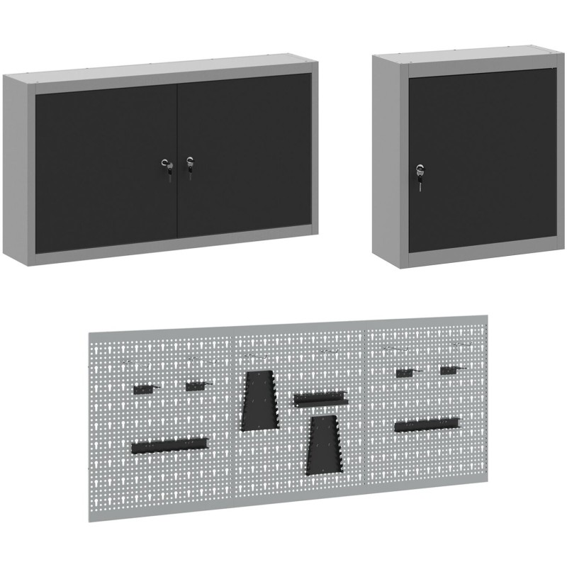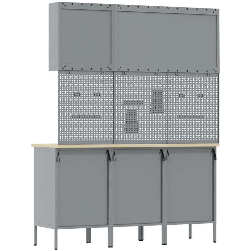 - Hängende Regalböden: Er verfügt über drei an der Wand montierte Regalböden, die den vertikalen Raum optimal nutzen und häufig verwendete Werkzeuge griffbereit halten. Dies hilft, Ordnung zu bewahren und erleichtert die Arbeit.