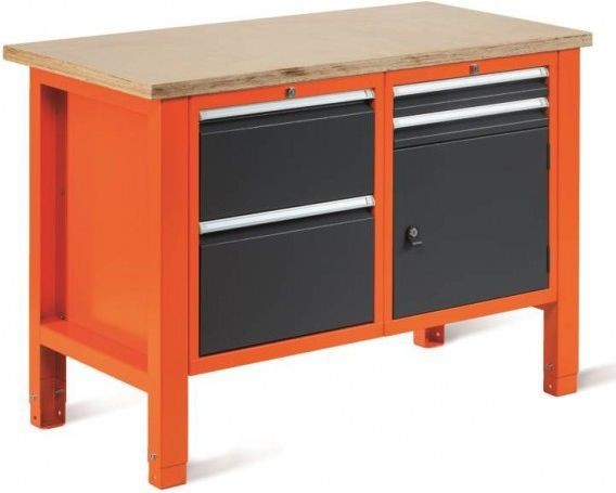Werkbank mit folgenden Eigenschaften:Höhe: 850–900 mmBreite: 1245 mmTiefe: 620 mmGewicht: 80 kgArbeitsplatte – BGestell – BSchrank – ASchrank – TZulässige Höchstbelastung der zweimoduligen Werkbank = 450 kg