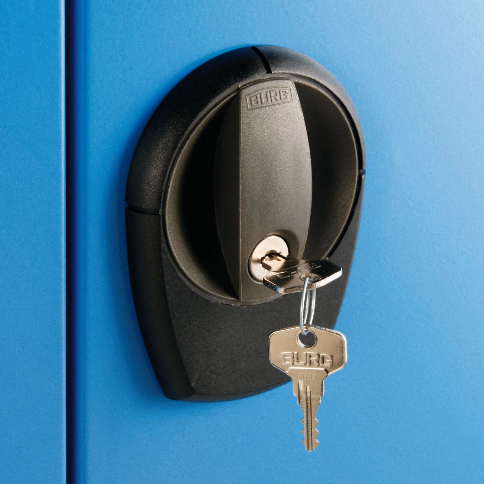 mit zwei Riegeln schützt den Inhalt vor unbefugtem Zugriff. Die Schranktüren sind