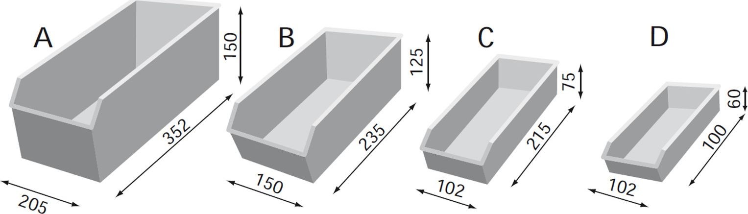 Abmessungen Behälter A B x T x H (mm): 205 x 352 x 150