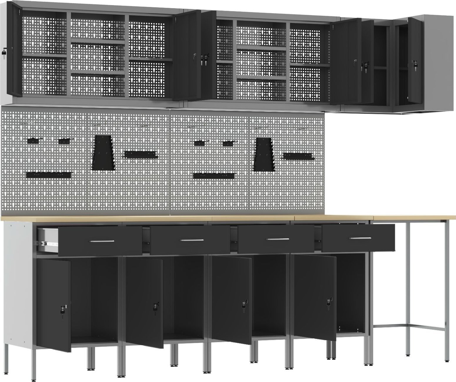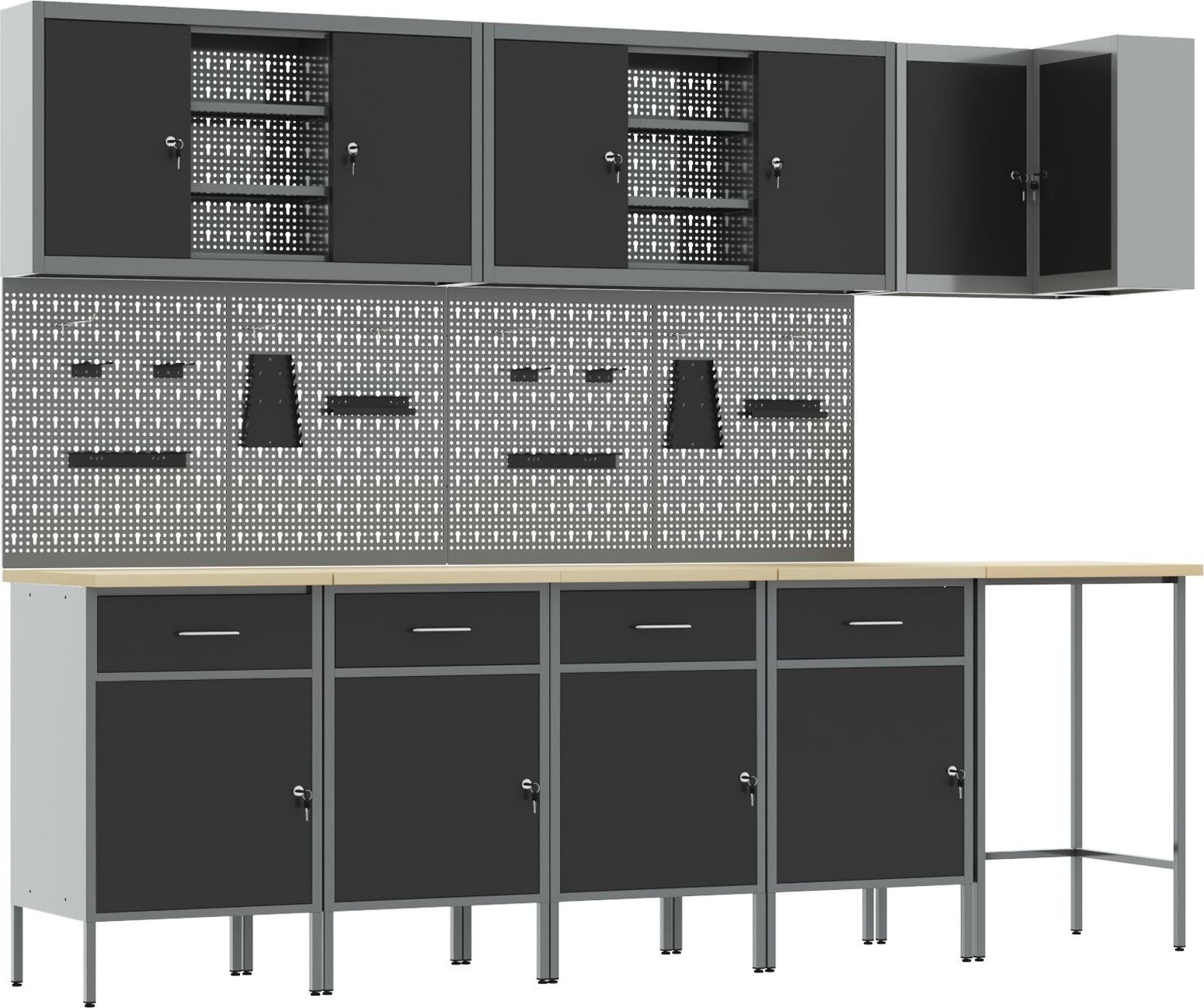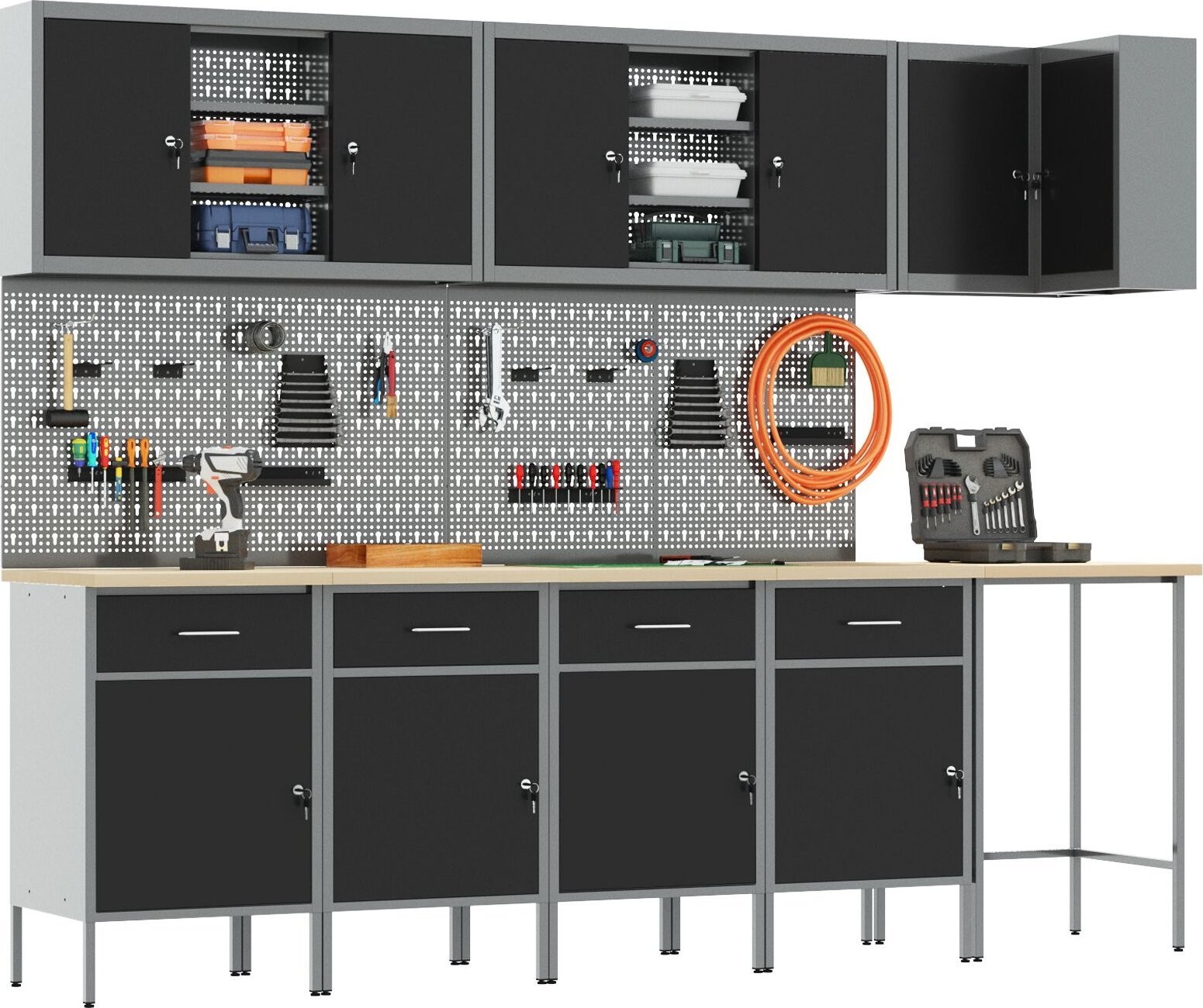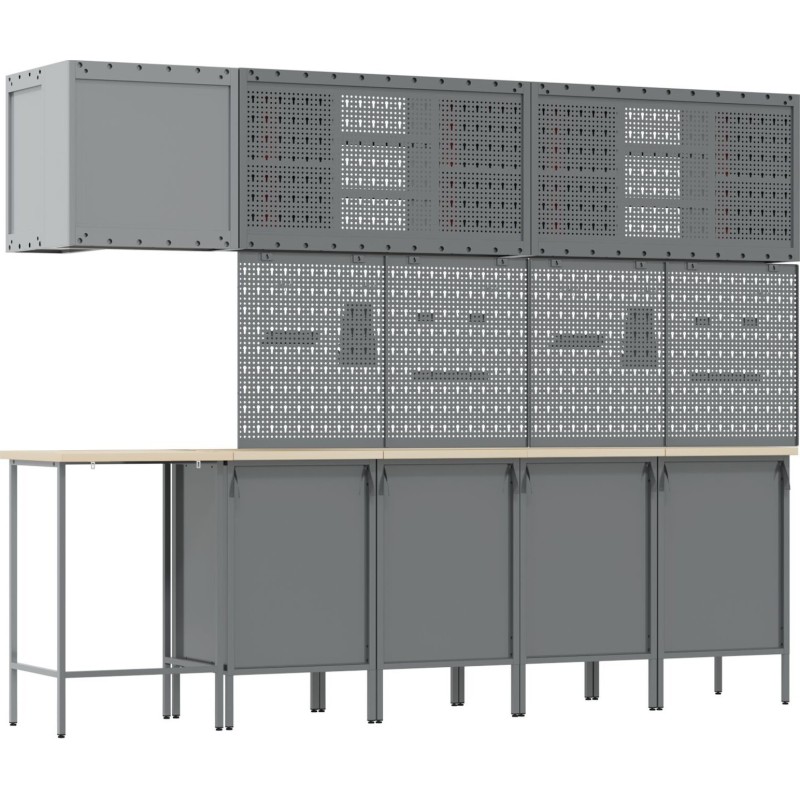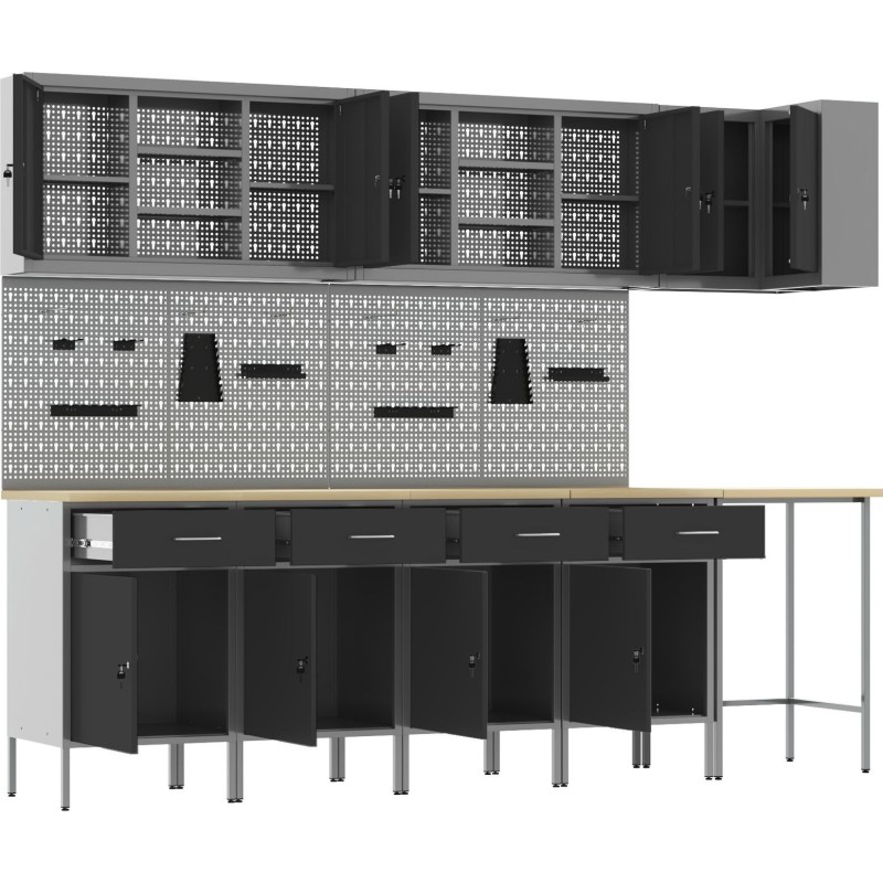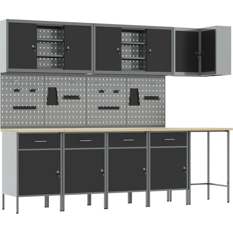 Dieses Schrankset für die Industriewerkstatt ist die Grundlage für jeden Arbeitsbereich und vereint Funktionalität mit modernem Design und solider Bauweise. Es eignet sich ideal für Garagen, Werkstätten oder Hauswirtschaftsräume und bietet dank einer Kombination aus Schubladen und Schränken viel Stauraum – perfekt für die Aufbewahrung von Werkzeugen und Zubehör.