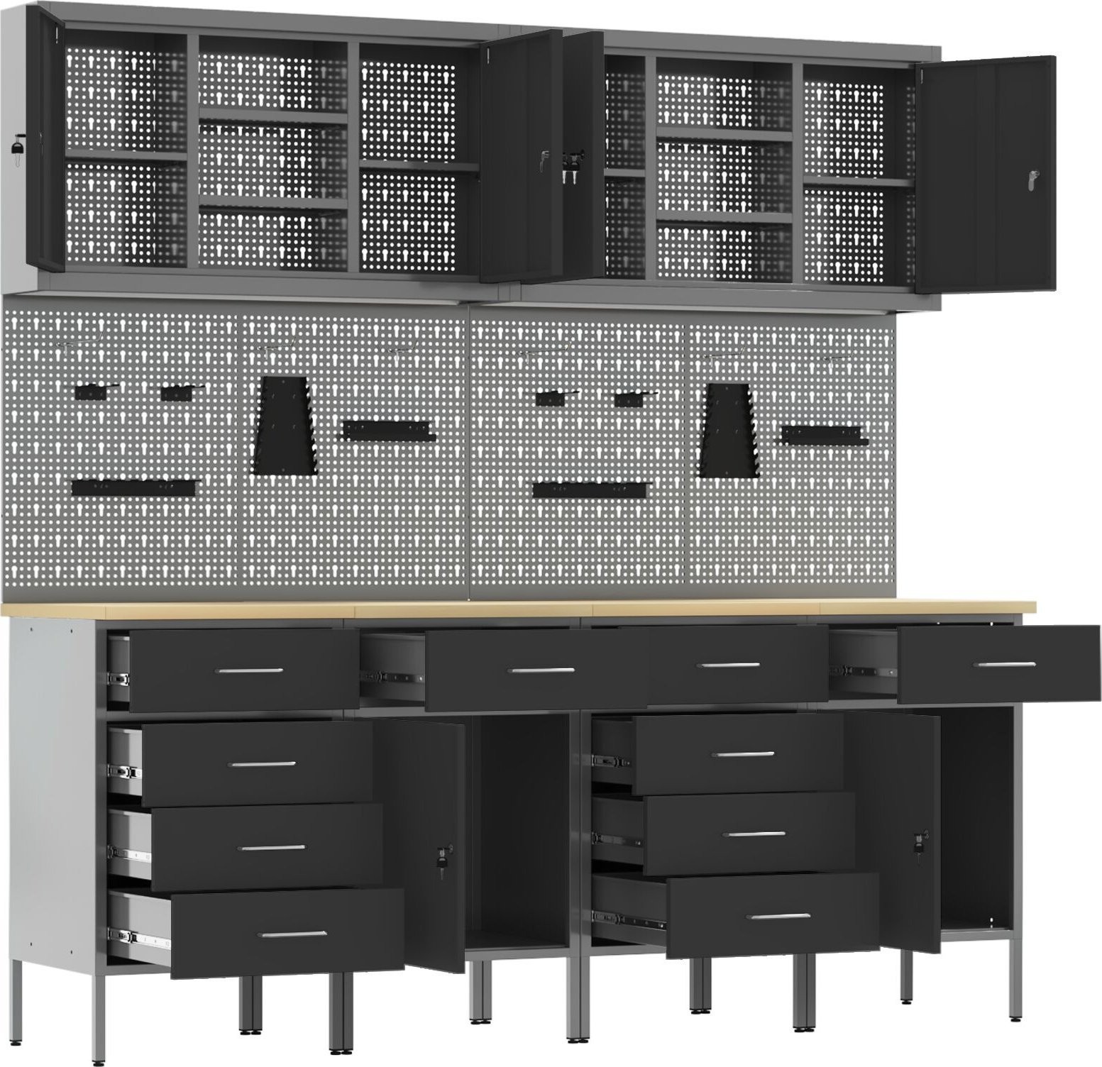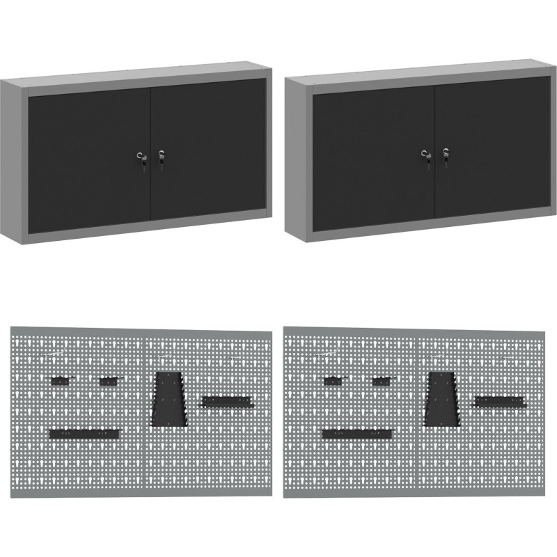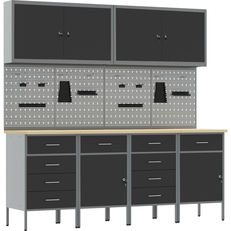 - Lieferumfang: 4 Arbeitsschränke, 2 Wandpaneele für Werkzeuge, 1 Arbeitstisch