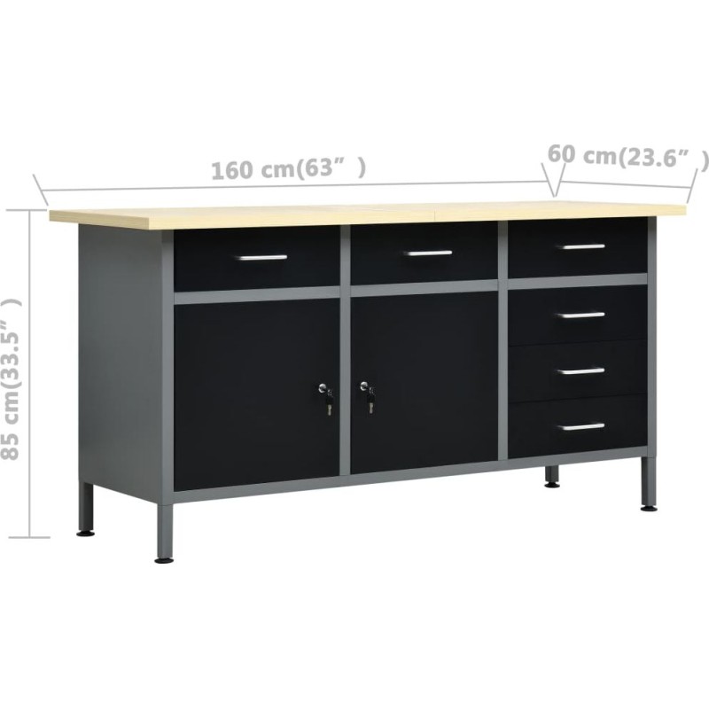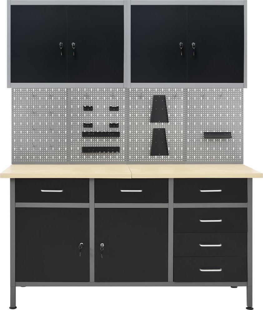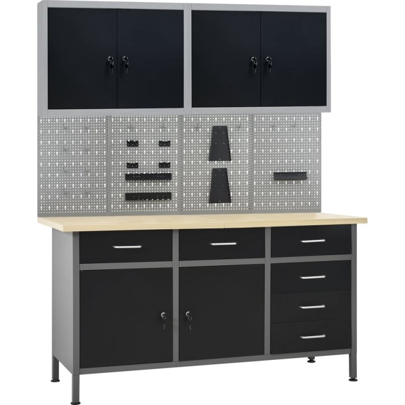 Dieses Set besteht aus 1 Arbeitstisch, 4 Wandpaneelen und 2 Wandschränken und bietet eine praktische Aufbewahrungslösung für die Werkstatt oder Garage. Der robuste Arbeitstisch zeichnet sich durch viel Stauraum und eine Tragkraft von 500 kg aus. Die große und stabile Arbeitsplatte bietet eine solide Arbeitsfläche für alle Reparaturarbeiten. Der Werkbanktisch verfügt über 6 Schubladen, um Werkzeuge, Teile und Zubehör wie Schrauben, Nägel und Klebeband ordentlich zu verstauen. Alle Schubladen sind mit kugelgelagerten Führungen ausgestattet, um ein leichtgängiges Ausziehen zu gewährleisten. Das Möbelstück verfügt über 2 Ablagefächer und einen großen Stauraum mit 2 abschließbaren Türen, in dem Bohrmaschinen, Kabeltrommeln und Schleifmaschinen problemlos Platz finden. Zudem sind die Füße höhenverstellbar. Diese Werkbank ist aus bestem Stahl und Spanplatten gefertigt, wodurch sie besonders robust, langlebig und leicht zu reinigen ist. Das Set ist einfach zu montieren. Diese Werkzeugpaneele aus massivem Stahl können das Gewicht verschiedener Werkzeuge wie Bohrmaschinen, Zangen, Schraubendreher und Schraubenschlüssel tragen. Die Platten sind perforiert, damit die Werkzeuge einfach und sicher aufgehängt werden können. Die 4 Paneele lassen sich miteinander verbinden, um ihre Stabilität zu erhöhen. Mit einer Breite von 160 cm ist dies die ideale Lösung für Ihren Arbeitstisch und Ihren Werkstattschrank. Das Möbelstück verfügt über zwei verstellbare Einlegeböden und eine perforierte Platte mit Löchern, an der verschiedene Werkzeuge wie Schraubenschlüssel, Zangen, Hämmer usw. aufgehängt werden können. Ausgestattet mit zwei abschließbaren Türen (jeweils 2 Schlüssel sind im Lieferumfang enthalten) sorgt der Schrank für mehr Sicherheit. Die Metallkonstruktion mit einer besonders robusten, kratzfesten Beschichtung macht das Möbelstück strapazierfähig und leicht zu reinigen. Das Produkt muss zusammengebaut werden. Werkbank: Farbe: schwarz, grau Material: Stahl, Spanplatte, Metalllegierung Maße: 160 x 60 x 85 cm (L x B x H) Plattenstärke: 3 cm Maximale Belastung: 500 kg Maximale Belastung einer einzelnen Schublade: 10–15 kg Mit 6 Schubladen auf Kugellagerschienen Mit 2 Schränken mit abschließbaren Türen Tischplatte mit holzähnlicher Maserung Höhenverstellbare Füße Montage erforderlich: ja WARNUNG: Um ein Umkippen des Produkts zu verhindern, müssen die mitgelieferten Befestigungselemente zur Wandmontage verwendet werden.Wandpaneel:Farbe: grau Material: StahlAbmessungen (Einzelstück): 40 x 58 x 1 cm (L x B x H)Metallstärke: 0,5 mmDurchmesser der kleinen Öffnung: 5,5 mmAbmessungen der Längsöffnung: 9,4 x 22,5 mm (B x H)Verschiedene ÖffnungenHängeschrank:Farbe: grau-schwarzMaterial: Metall Maße (jeweils): 80 x 19 x 60 cm (B x T x H) Mit 2 verstellbaren Einlegeböden mit Aufhängern und 1 Lochblech Mit 2 abschließbaren Türen (zu jeder Tür gehören 2 Schlüssel) Montage erforderlich: ja Lieferumfang: 1 x Werkbank 4 x Wandpaneel 21 x Montagezubehör 2 x Hängeschrank...