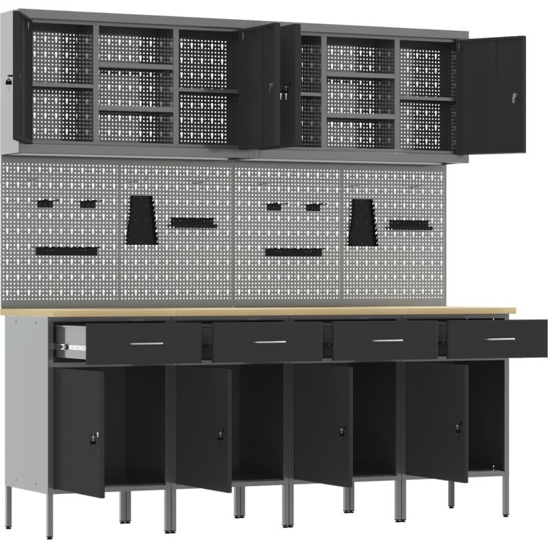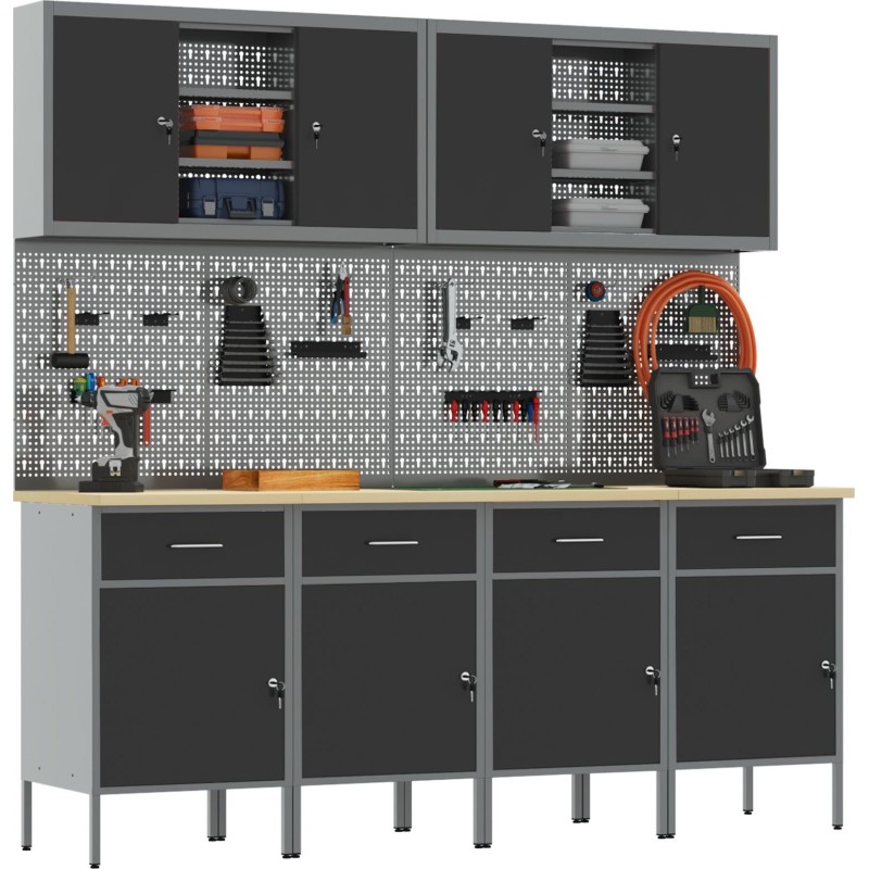 Dieser industrielle Arbeitsschrank aus robustem Stahl und Holzwerkstoffen bietet eine praktische und stilvolle Aufbewahrungslösung, ideal für die Garage oder die Werkstatt. Mit seinem coolen Design in Schwarz und Grau wurde er so konzipiert, dass er die Funktionalität erhöht und an jedem Arbeitsplatz gut zur Geltung kommt.