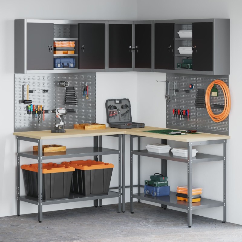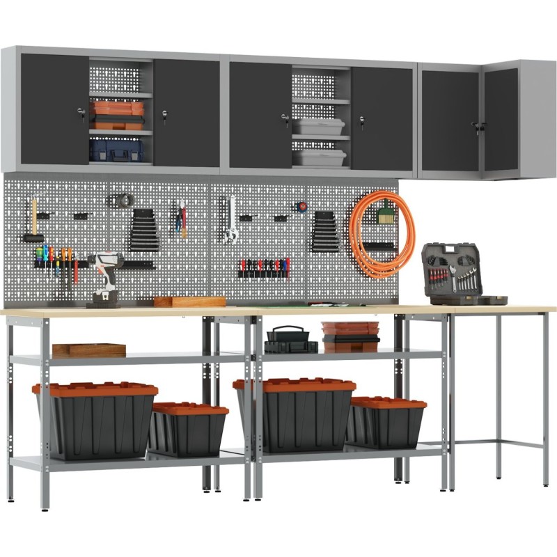 - Integrierte Aufbewahrung: Zahlreiche Lochplatten und Schränke helfen dabei, den Arbeitsplatz ordentlich zu halten. Das erleichtert nicht nur die Arbeit, sondern sorgt auch für mehr Ordnung und steigert die Produktivität, da alles seinen festen Platz hat.