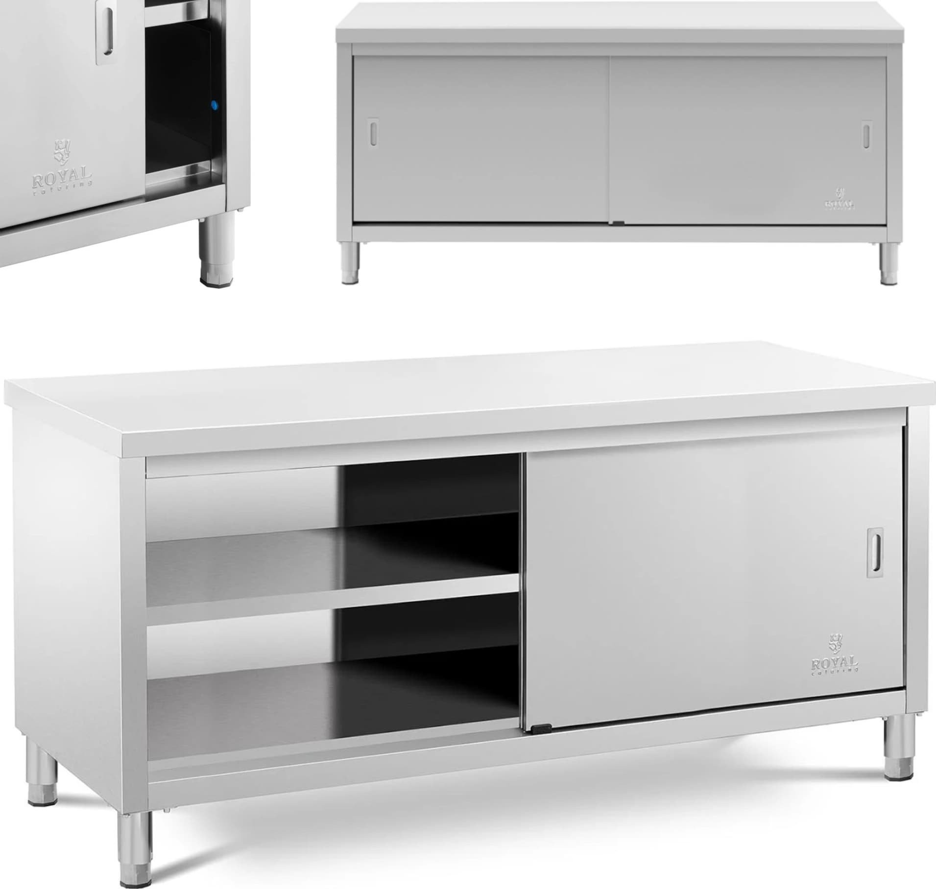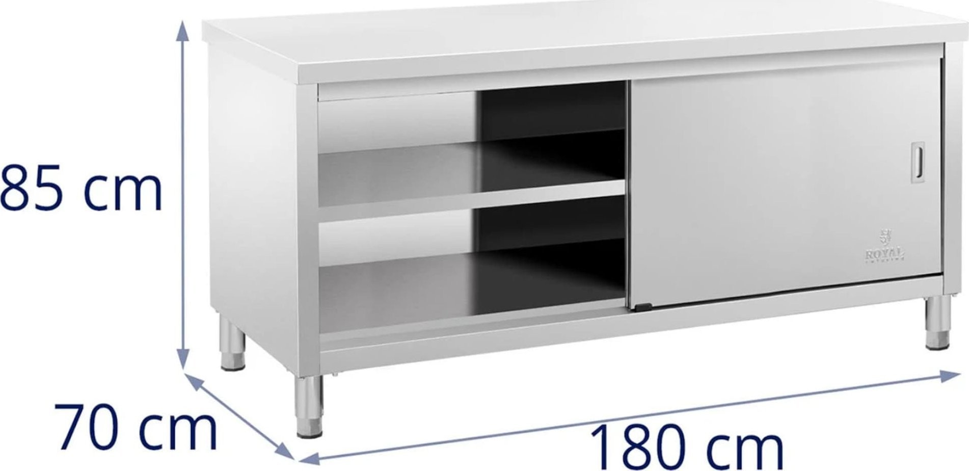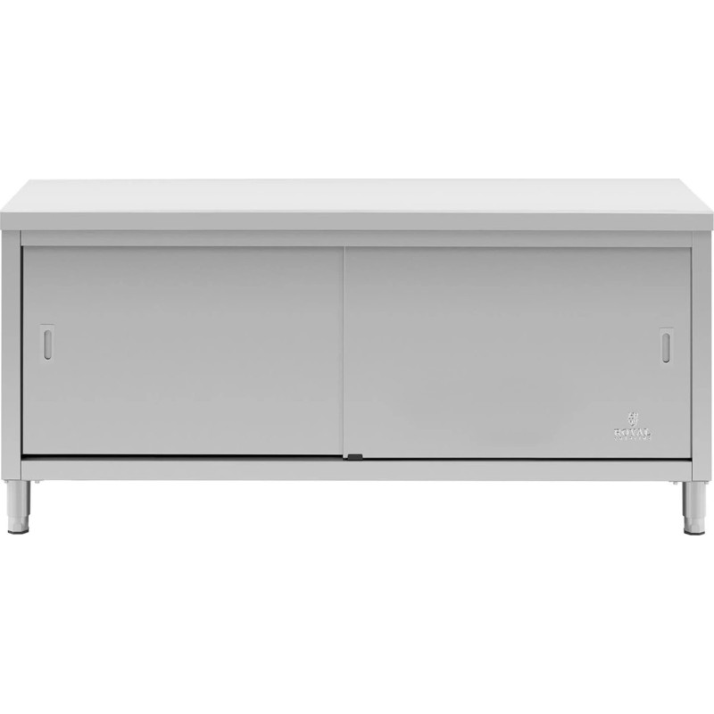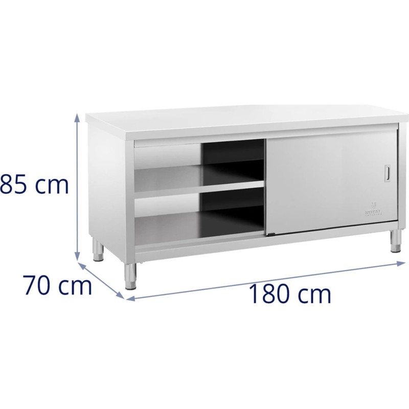 Der Gastronomietisch der Marke Royal Catering eignet sich für Restaurants, Hotels, Kantinen, Geschäfte usw. Die Arbeitsfläche von 180 x 70 cm bietet viel Platz zum Arbeiten. Der große Schrank bietet Platz für eine große Menge an Küchenutensilien. Er wird mit Schiebetüren verschlossen, die wenig Platz beanspruchen, sicher in der Anwendung sind und einen einfachen Zugang zum Innenraum gewährleisten. Das Möbelstück ist aus Edelstahl gefertigt, widerstandsfähig gegen Beschädigungen und hartnäckige Verschmutzungen. Seine Konstruktion hält einer Gesamtbelastung von bis zu 600 kg stand. 4 verstellbare Füße (0–2 cm) sorgen für Stabilität auch auf unebenen Böden.