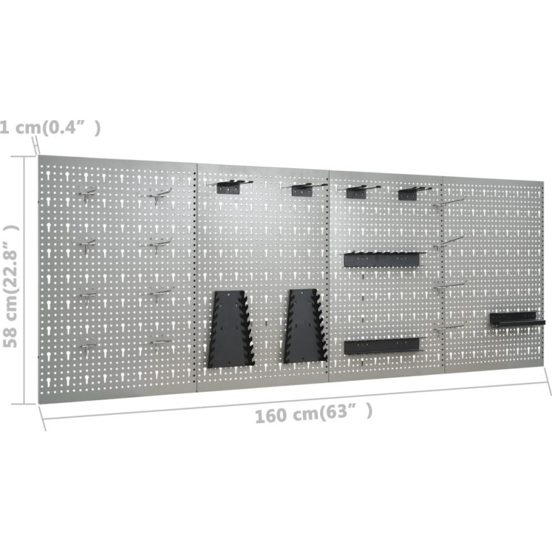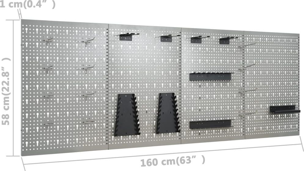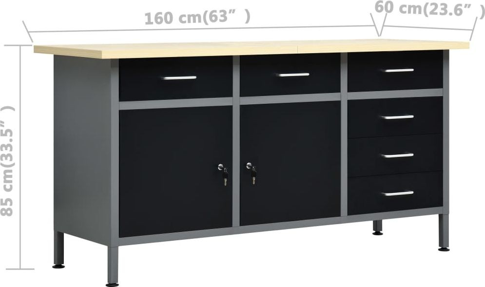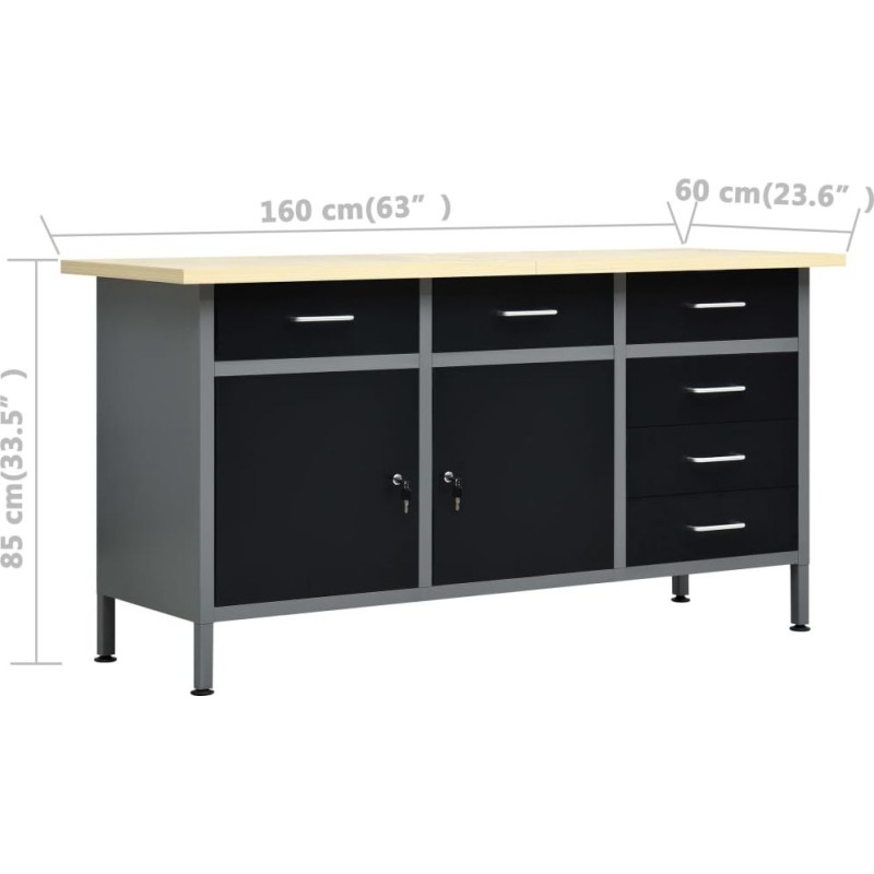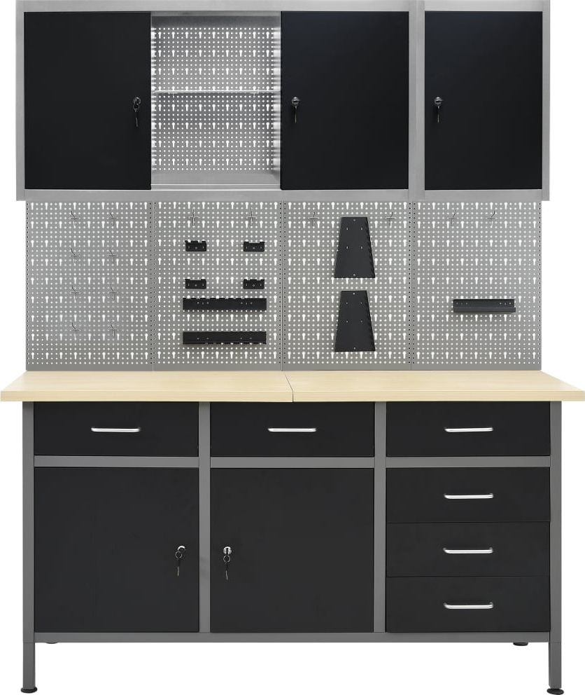 Dieses Set besteht aus 1 Arbeitstisch, 4 Wandpaneelen und 2 Wandschränken und bietet eine praktische Aufbewahrungslösung für die Werkstatt oder Garage. Der robuste Arbeitstisch zeichnet sich durch viel Stauraum und eine Tragkraft von 500 kg aus. Die große und stabile Arbeitsplatte bietet eine solide Arbeitsfläche für alle Reparaturarbeiten. Der Werkbanktisch verfügt über 6 Schubladen, um Werkzeuge, Teile und Zubehör wie Schrauben, Nägel und Klebeband ordentlich zu verstauen. Alle Schubladen sind mit kugelgelagerten Führungen ausgestattet, um ein leichtgängiges Ausziehen zu gewährleisten. Das Möbel verfügt über 2 Ablagefächer und einen großen Stauraum mit 2 abschließbaren Türen, in dem Bohrmaschinen, Kabeltrommeln und Schleifmaschinen bequem Platz finden. Zudem sind die Füße höhenverstellbar. Diese Werkbank ist aus bestem Stahl und Spanplatten gefertigt, wodurch sie besonders robust, langlebig und leicht zu reinigen ist. Das Set ist einfach zu montieren. Die Werkzeugpaneele bestehen aus massivem Stahl, um das Gewicht verschiedener Werkzeuge wie Bohrer, Zangen, Schraubendreher und Schraubenschlüssel zu tragen. Die Platten sind perforiert, um Werkzeuge einfach und sicher aufhängen zu können. Die 4 Paneele lassen sich miteinander verbinden, um ihre Stabilität zu erhöhen. Mit einer Breite von 160 cm ist dies die ideale Lösung für Ihren Arbeitstisch und Ihren Schrank in der Werkstatt. Dieses Set verfügt über zwei Schränke zur Aufbewahrung von Werkzeugen. Der große Schrank verfügt über drei verstellbare Einlegeböden und eine Lochplatte. Der kleinere Schrank hat einen verstellbaren Einlegeboden und eine Lochplatte zum Aufhängen verschiedener Werkzeuge wie Schraubenschlüssel, Zangen, Hämmer usw. Der Werkzeugschrank ist mit einer abschließbaren Tür (2 Schlüssel im Lieferumfang enthalten) ausgestattet, um für mehr Sicherheit zu sorgen. Er besteht aus Metall mit einer besonders robusten, kratzfesten Beschichtung, wodurch er langlebig und leicht zu reinigen ist. Dieses Produkt muss zusammengebaut werden.Werkbank:Farbe: schwarz, grauMaterial: Stahl, Spanplatte, MetalllegierungMaße: 160 x 60 x 85 cm (L x B x H)Plattenstärke: 3 cmMaximale Belastung: 500 kgMaximale Belastung einer einzelnen Schublade: 10–15 kg Mit 6 Schubladen auf Kugellagerschienen Mit 2 Schränken mit abschließbaren Türen Tischplatte mit holzähnlicher Maserung Höhenverstellbare Füße Montage erforderlich: ja WARNUNG: Um ein Umkippen des Produkts zu verhindern, müssen die mitgelieferten Befestigungselemente zur Wandmontage verwendet werden.Wandplatte:Farbe: grau Material: StahlAbmessungen (Einzelstück): 40 x 58 x 1 cm (L x B x H)Metallstärke: 0,5 mmDurchmesser der kleinen Öffnung: 5,5 mmAbmessungen der Längsöffnung: 9,4 x 22,5 mm (B x H)Verschiedene ÖffnungenHängeschrank (Breite 120 cm):Farbe: grau-schwarzMaterial: Metall Abmessungen: 120 x 19 x 60 cm (B x T x H)Mit 3 verstellbaren Einlegeböden mit Haken und 1 LochblechMit 6 abschließbaren Türen (2 Schlüssel im Lieferumfang enthalten)Montage erforderlich: jaHängeschrank (Breite 40 cm):Farbe: grau-schwarzMaterial: Metall Maße: 40 x 19 x 60 cm (B x T x H) Mit 1 verstellbarem Einlegeboden und 1 LochblechMit 1 abschließbarer Tür (2 Schlüssel im Lieferumfang enthalten) Montage erforderlich: jaLieferumfang:1 x Werkbank4 x Wandpaneel21 x Montagezubehör1 x Hängeschrank (Breite 120 cm)1 x Hängeschrank (Breite 40 cm)Weitere Informationen zur Kippschutzvorrichtung für Möbel finden Sie hier https://media.vidaxl.com/media/wysiwyg/documents/prevent_tipping_over/PL.pdf ...