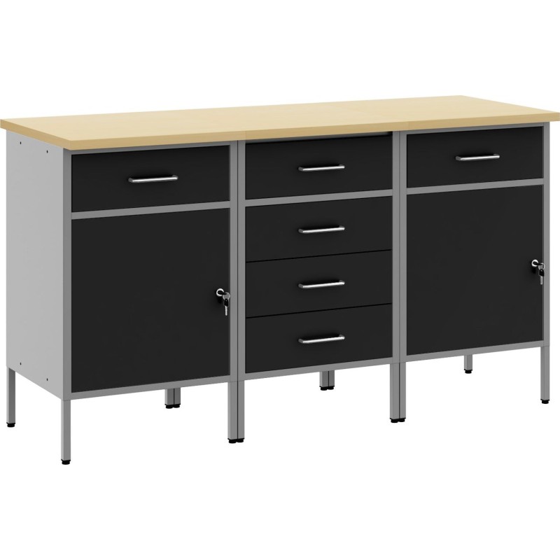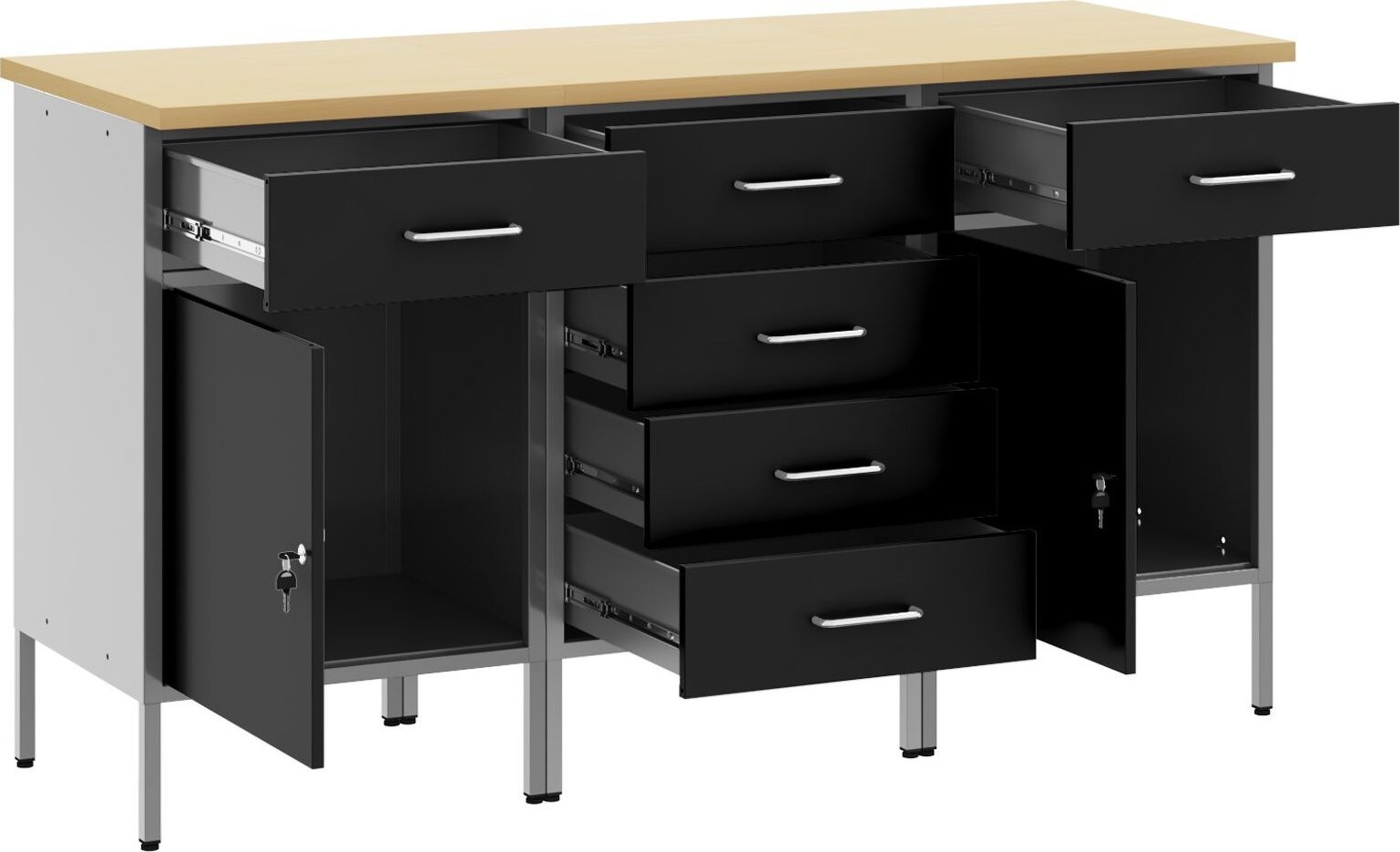 Dieser Arbeitsschrank ist eine gelungene Kombination aus Stil und Funktionalität und eignet sich ideal für jede Werkstatt oder Garage. Robuster Stahl und Holzwerkstoff bieten viel Stauraum mit zahlreichen Schubladen und sehen dabei auch noch gut aus.