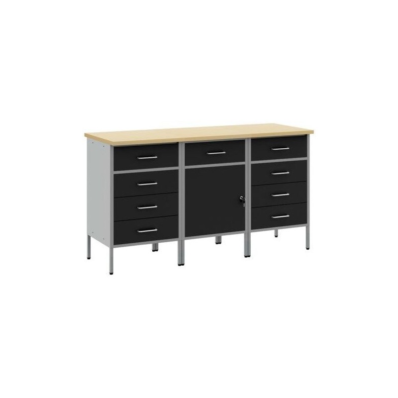 Das Set enthält einen Schrank mit einer Schublade und einem abschließbaren Stauraum, was eine sichere Aufbewahrung von Werkzeugen ermöglicht. Zusätzlich erleichtern zwei Arbeitsschränke mit vier Schubladen die Organisation und den schnellen Zugriff auf benötigte Gegenstände. Dank der durchdachten Konstruktion unterstützt jedes Element des Sets die Arbeitseffizienz.