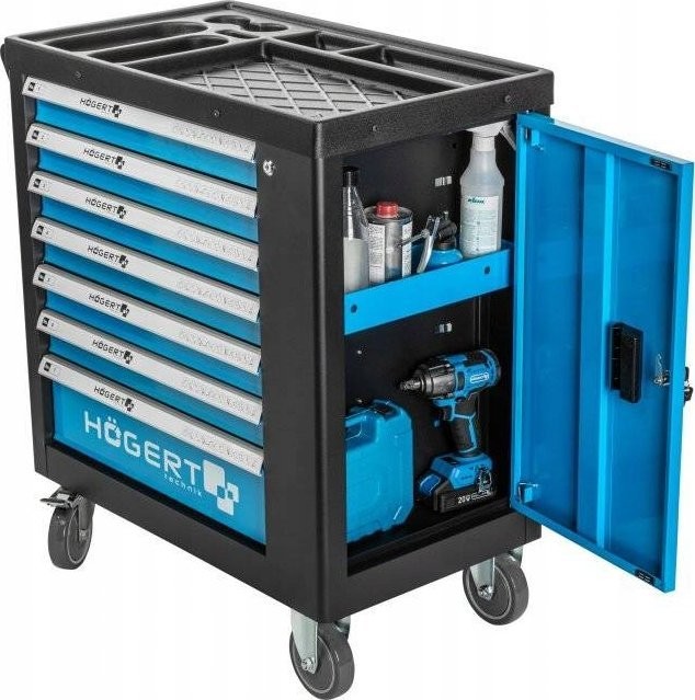 Praktischer und geräumiger Werkstattschrank mit 7 Schubladen und seitlichem Staufach. Die solide Konstruktion garantiert eine lange Lebensdauer unter Werkstattbedingungen, während 4 Rollen, darunter 2 Lenkrollen, für Mobilität sorgen, sodass der Schrank immer am richtigen Ort steht. Die sorgfältig ausgewählte Ausstattung des Schranks, bestehend aus bis zu 544 Elementen, ist speziell auf Handwerksbetriebe und Kfz-Werkstätten zugeschnitten und eignet sich daher perfekt für die Arbeit jedes Profis.