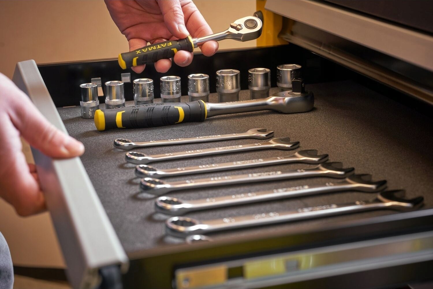 - Ein seitlicher Verriegelungsschlüssel ermöglicht die sichere Aufbewahrung der Werkzeuge im Schrank, wenn diese nicht in Gebrauch sind