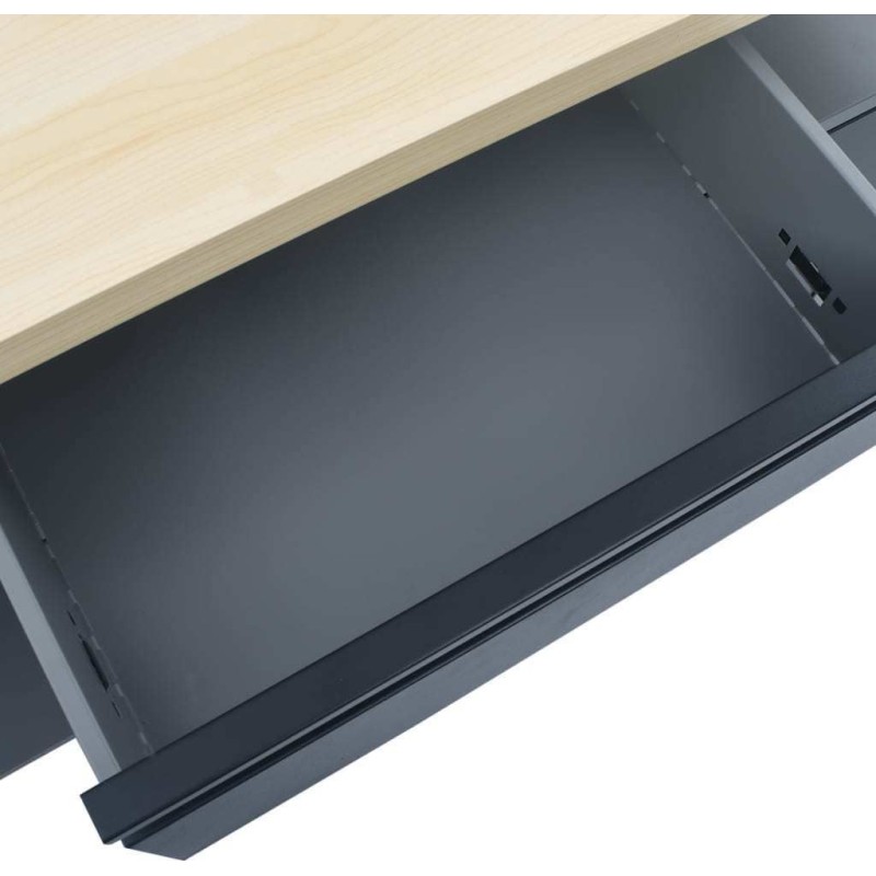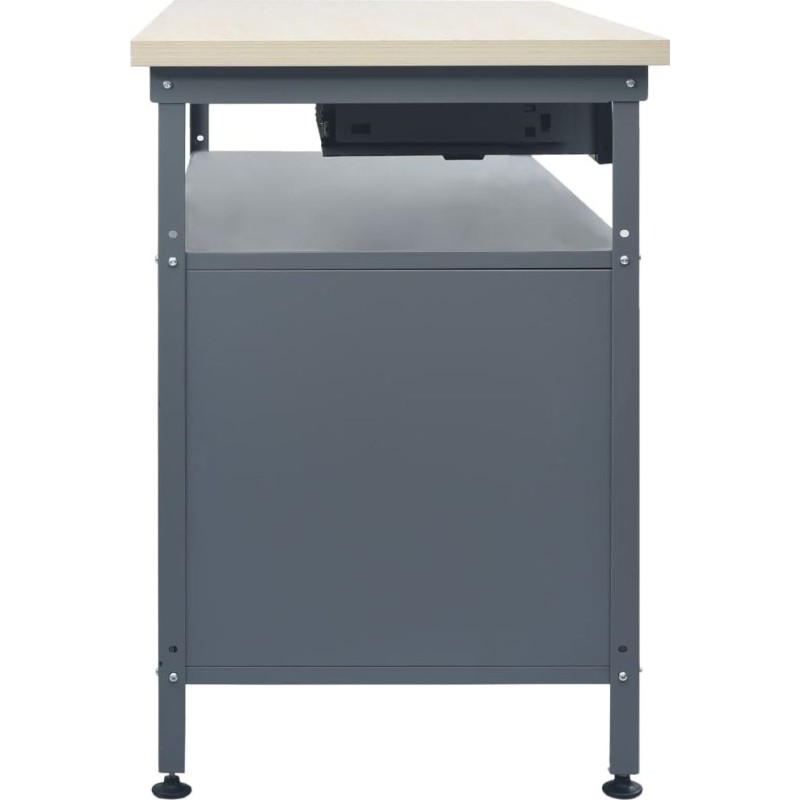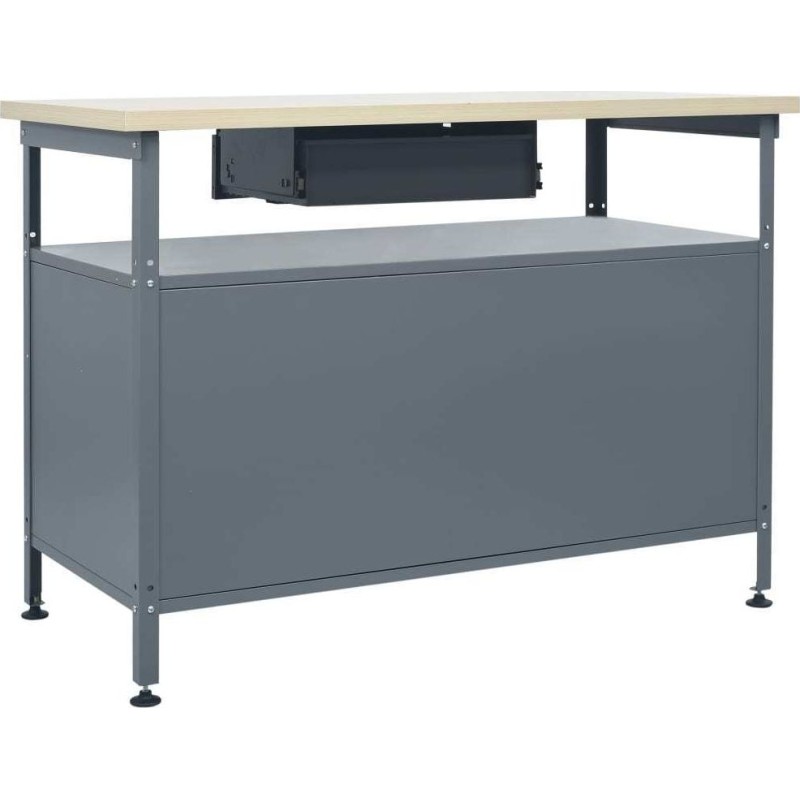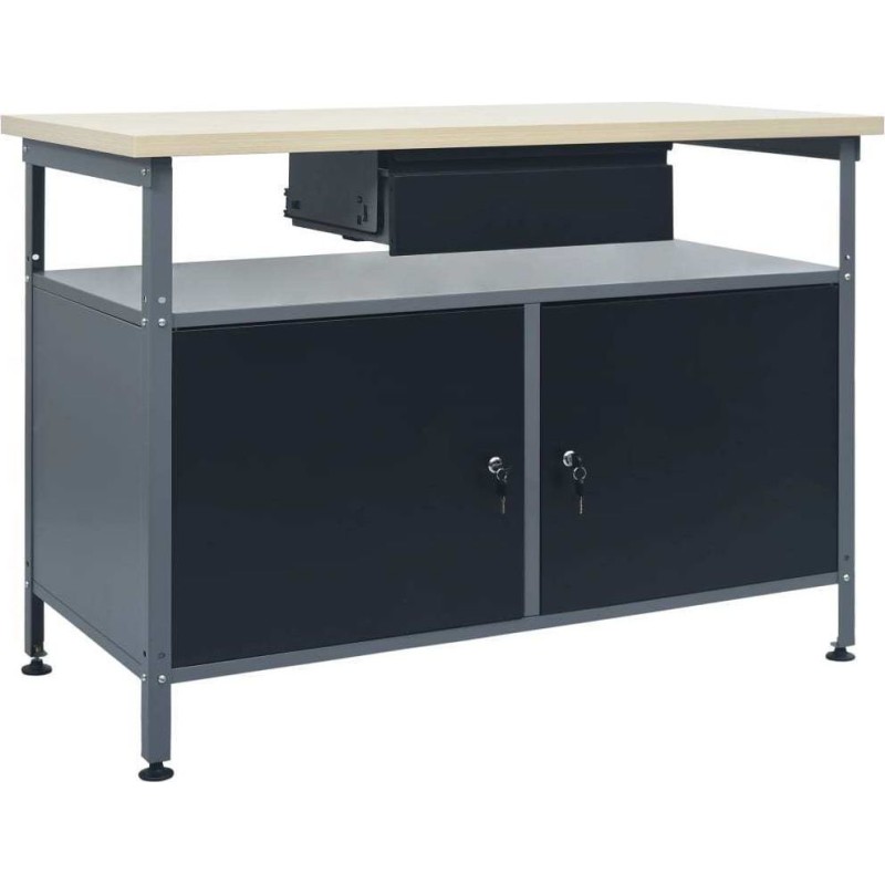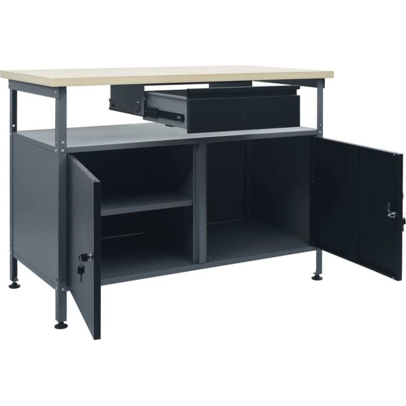 Die große und stabile Arbeitsplatte bietet eine solide Arbeitsfläche für alle Reparaturarbeiten. Der Werkbanktisch verfügt über ein offenes Regal mit einer Schublade, sodass Sie Werkzeuge, Teile und Zubehör wie Schrauben, Nägel und Klebebänder ordentlich verstauen können. Das Möbelstück verfügt über geeignete Fächer für größere Werkzeuge sowie 2 Schränke mit verschließbaren Türen, in denen Bohrmaschinen, Kabelrollen und Schleifmaschinen bequem Platz finden.