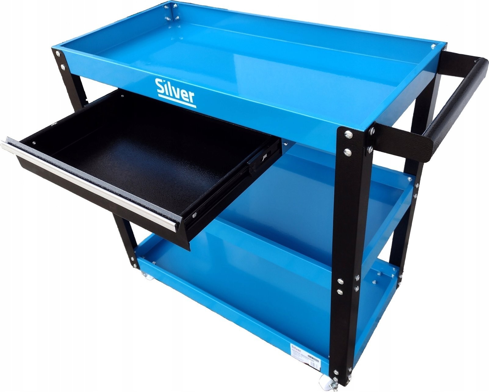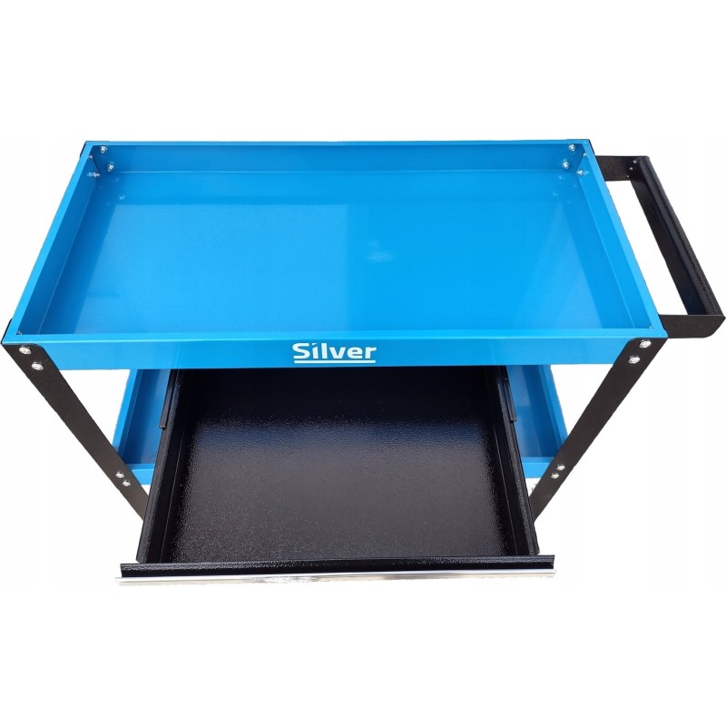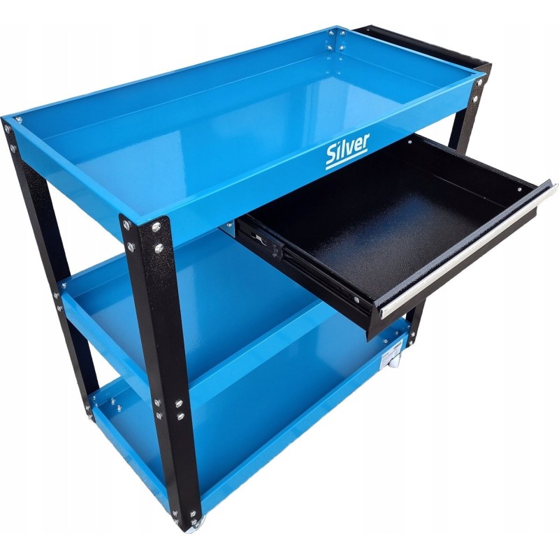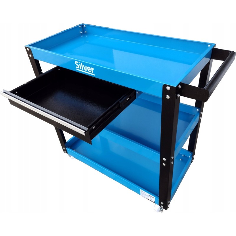 Stahlwagen mit drei Ablagen und einer Schublade. Ideal für Werkstätten und Servicebetriebe, aber auch eine großartige Lösung für Heimwerker. Erleichtert die Arbeit, jedes Werkzeug ist immer griffbereit.
