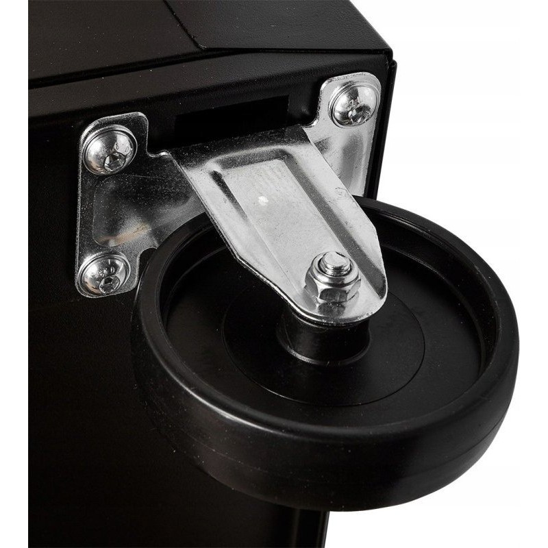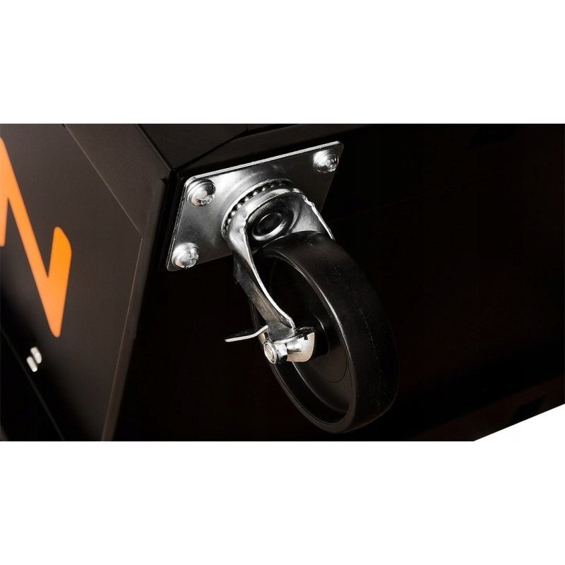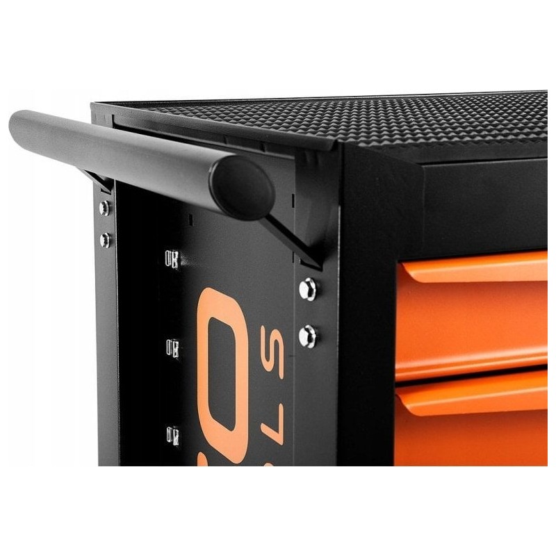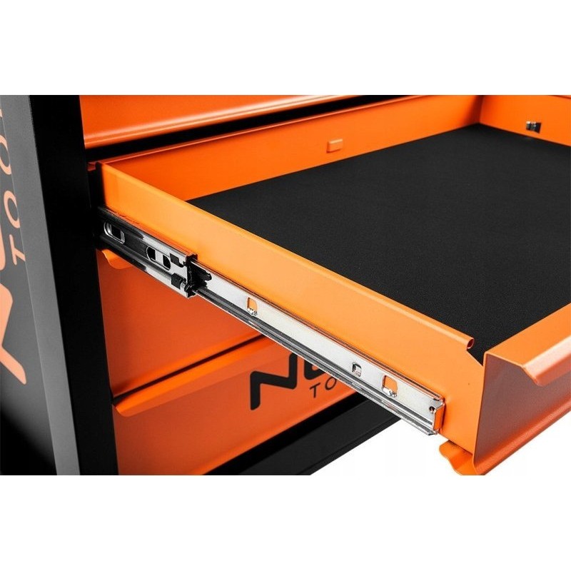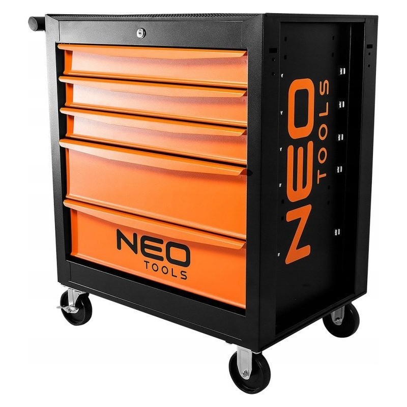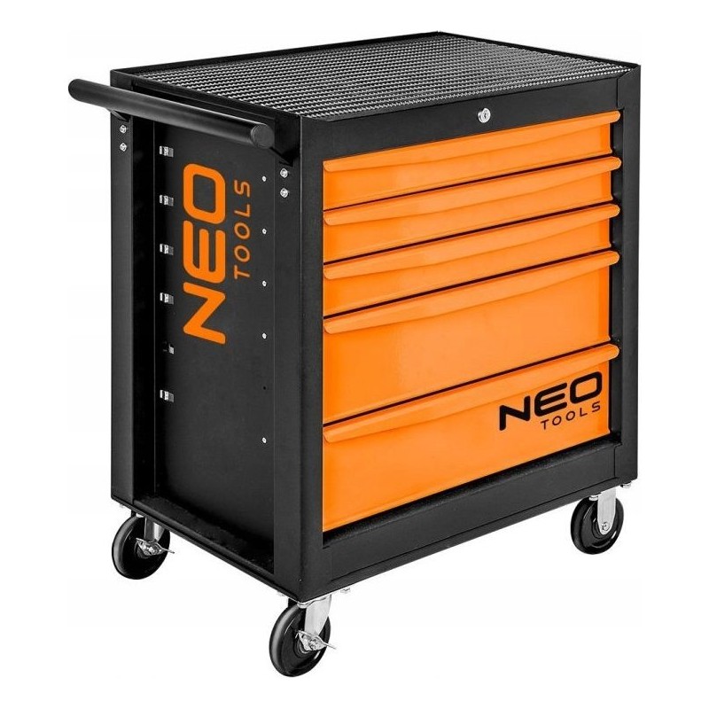 Werkstattschrank NEO (Art.-Nr. 84-214) mit den Maßen 680 x 460 x 825 mm. Der Schrank verfügt über 5 praktische Schubladen für Werkzeuge, die mit einem Zentralverschluss gesichert werden. Alle Schubladen lassen sich vollständig ausziehen und sind mit Kugelführungen ausgestattet, die eine langlebige, leichtgängige und zuverlässige Funktion gewährleisten. Die Oberfläche der Arbeitsplatte ist mit einer öl- und fettbeständigen Gummibeschichtung versehen. Vier Zoll große Lenkrollen erleichtern das Manövrieren des Schranks und sind zusätzlich mit einer Bremse ausgestattet. Die Tragkraft des Schranks beträgt 280 kg. Der Schrank ist mit einem Griff ausgestattet, der das Ziehen erleichtert.