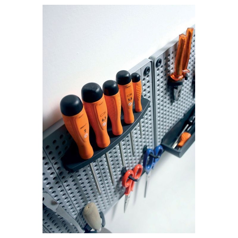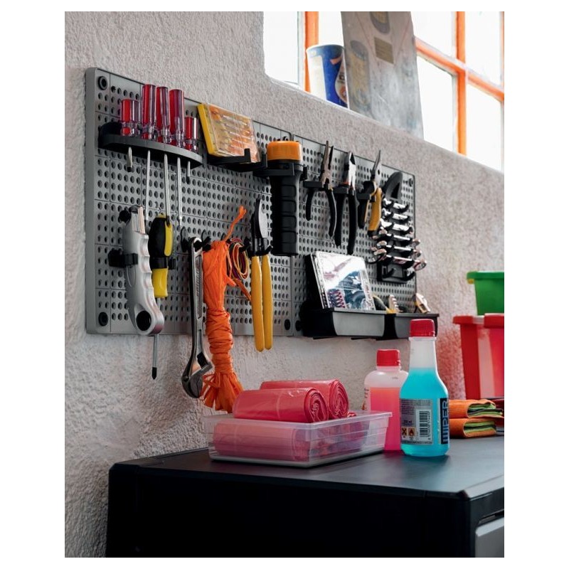 Ein sehr praktischer und stilvoller Werkzeughalter aus äußerst strapazierfähigem Kunststoff. Der Werkzeughalter wird einfach direkt an der Wand befestigt und eignet sich ideal zur Aufbewahrung aller Werkzeuge, die Sie immer griffbereit haben müssen. Horizontal oder vertikal verstellbar. Im Lieferumfang enthalten sind 2 x Werkzeughalter und eine große Auswahl an Zubehör. Technische Daten: Produkthöhe: 31 cm (2x) Produktbreite: 50 cm (2x) Produktlänge: 7 cm Material: Kunststoff Farbe: Grau + Schwarz Lieferumfang: 1x Wand-Werkzeugorganizer – TOOLS