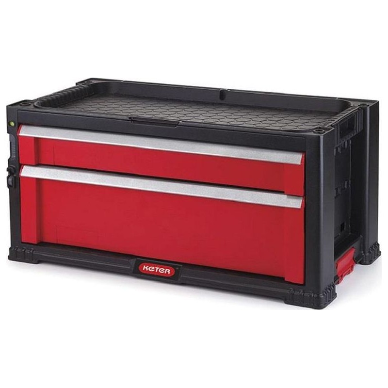 Robuste Werkzeugkiste aus stabilem und widerstandsfähigem Kunststoff mit zwei Schubladen. Die Fächer sind unterschiedlich groß, die obere Schublade eignet sich für kleine Gegenstände und ist in vier kleinere Fächer unterteilt. Die untere Schublade ist größer und eignet sich für größere Werkzeuge. Die Box ist stapelbar und lässt sich mit anderen KETER-Boxen kombinieren. Ideal für Garagen oder Werkstätten. Hochwertige KETER-Qualität.