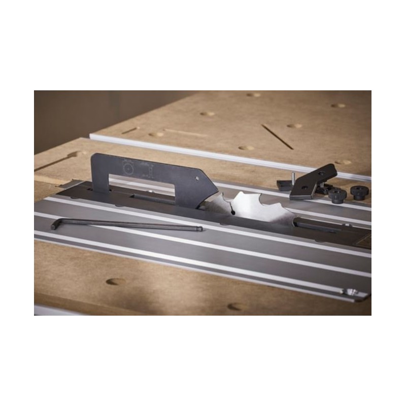 Optionales Zubehör: Mit der Führungsschiene FKS 145 (Art.-Nr. 6913000) können große Werkstücke auf dem Tisch geschnitten werden, um
