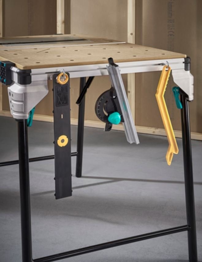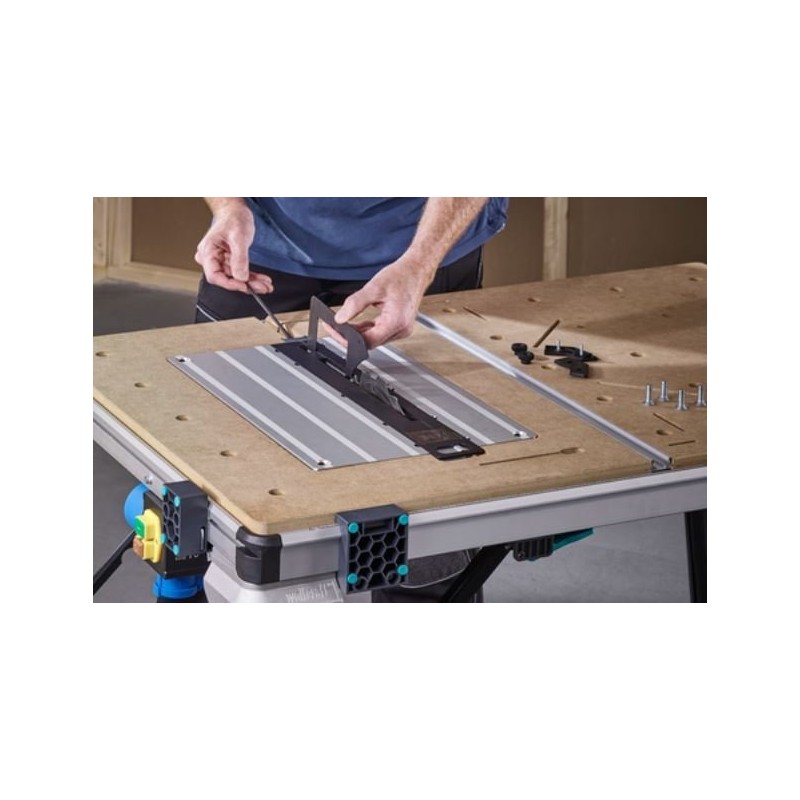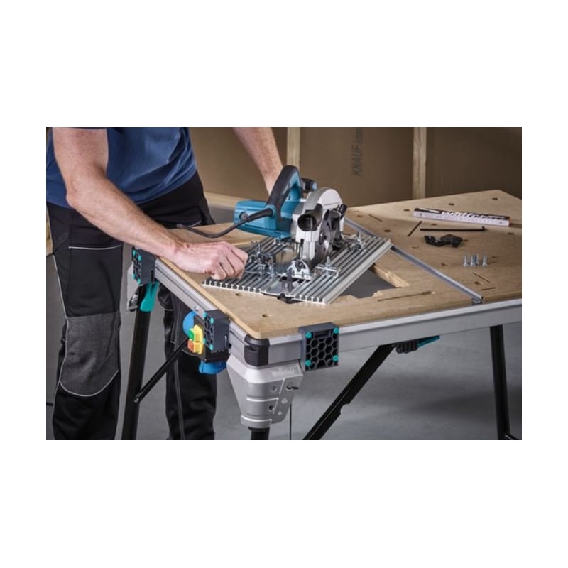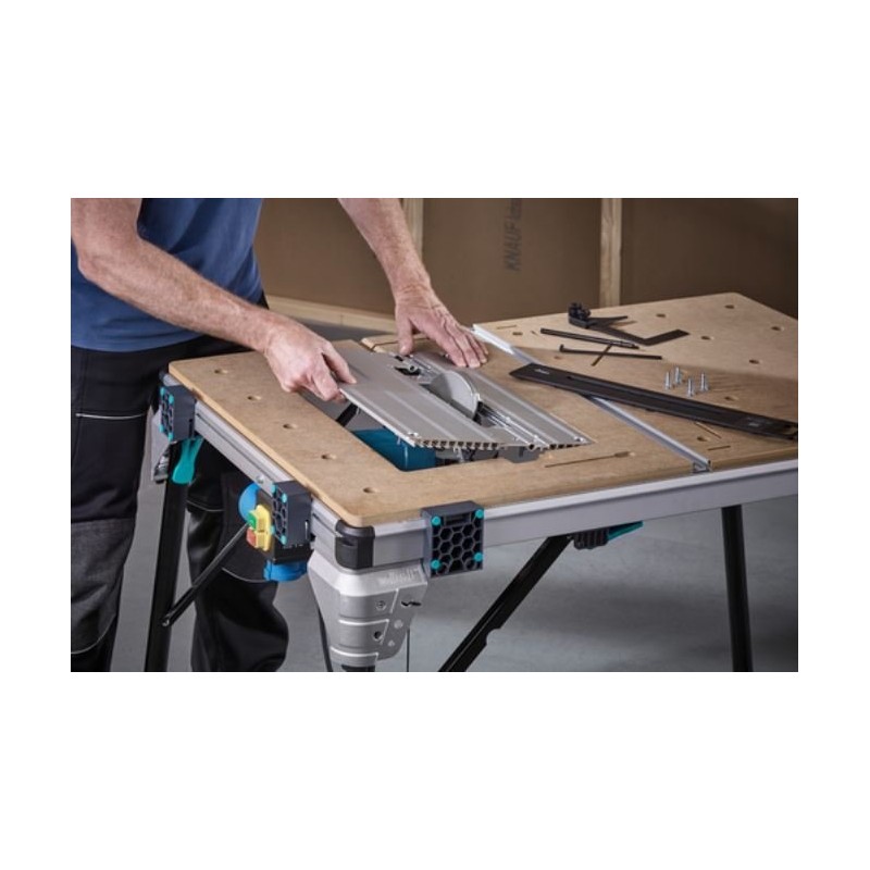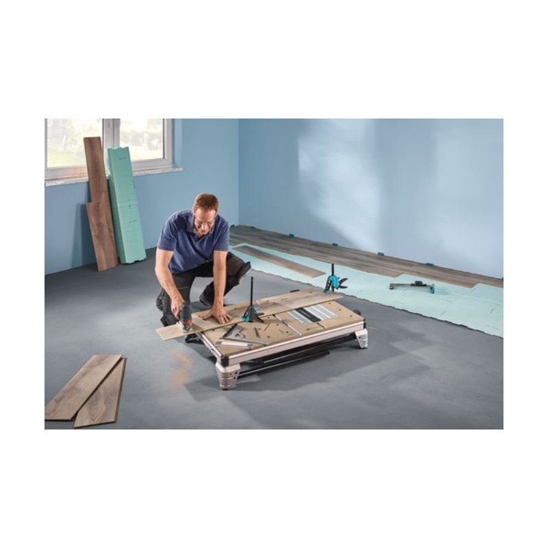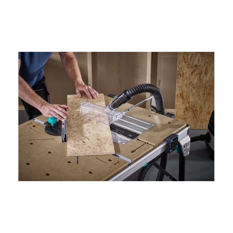 Der multifunktionale Maschinentisch MASTER Cut 2600 vereint sechs Funktionen in einem Produkt. Er kann als Tisch für Kreissägen, Stichsägen, Gehrungssägen, als Arbeitstisch sowie – mit optionalem Zubehör – als Frästisch und als Tisch für Kreissägen mit Führung genutzt werden. Damit ist der MASTER Cut 2600 die ideale Lösung für alle Branchen, die sich mit Innenausbauarbeiten befassen. Dank des herausnehmbaren Spaltkeils (separat erhältlich) ist er einer der wenigen Maschinentische, der auch mit Handkreissägen ohne Spaltkeil verwendet werden kann. Die Maschinenplatte ist mit einer Sicherheitsverriegelung ausgestattet, die die Platte und das Werkzeug zuverlässig sichert. Sie ist zudem höhenverstellbar, was auch bei schwerem Werkzeug einen flachen Übergang zur Arbeitsplatte gewährleistet. Der MASTER cut 2600 ist mit vielen auf dem Markt erhältlichen Werkzeugen kompatibel, unabhängig vom Hersteller. Der Sicherheitsschalter befindet sich an der Seite des Tisches, sodass die Werkzeuge schnell und sicher ein- und ausgeschaltet werden können. Bei Verwendung als Kreissäge ermöglicht der Parallelanschlag Schnitte bis zu einer Schnittbreite von 625 mm. Der Winkelanschlag ist mit Ausgleichselementen und federgeführten Gleitelementen ausgestattet. Damit lassen sich problemlos Schrägschnitte bis +/- 60° ausführen, einschließlich einer Reihe von Wiederholungsschnitten. Im Lieferumfang sind vier Klemmblöcke enthalten, mit denen die Werkstücke mithilfe von Klemmen fest am Tischprofil befestigt werden können. Mit dem beiliegenden Inbusschlüssel lassen sich die Klemmblöcke verschieben, um sie an das Werkstück anzupassen. Gleichzeitig dienen diese nach dem Zusammenklappen als Tischbeine, sodass er als sehr kompakte, freistehende Einheit gelagert werden kann. Der Maschinentisch kann dank einer Tragkraft von bis zu 120 kg problemlos sogar Massivholzbretter halten. Mit nur einem Produkt sind Sie zuverlässig und effektiv für unzählige Herausforderungen zu Hause gerüstet.