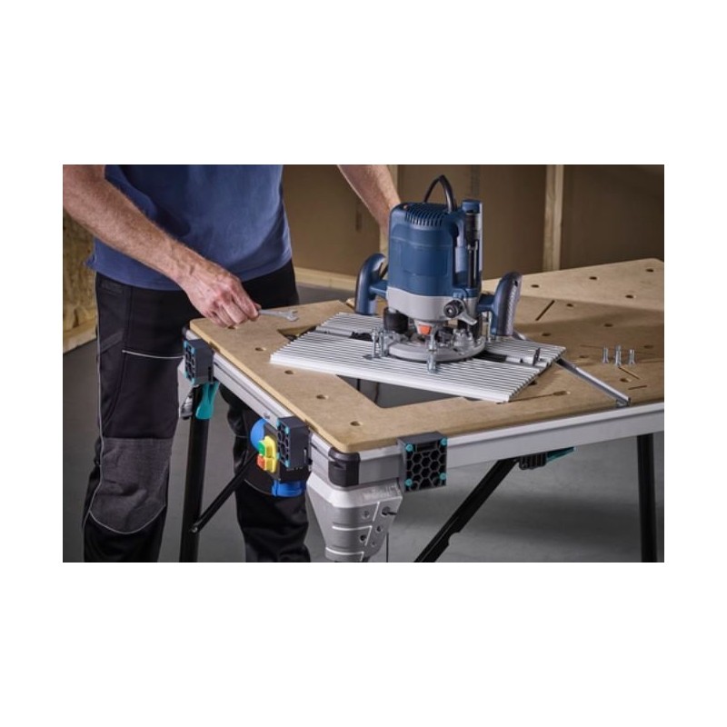 Kompatible Werkzeuggröße: Oberfräsen mit max. 230 V / max. 1800 W, Grundplatte mit max. 180 mm Durchmesser, Grundplattenhöhe max. 40 mm und Fräserdurchmesser max. 27 mm