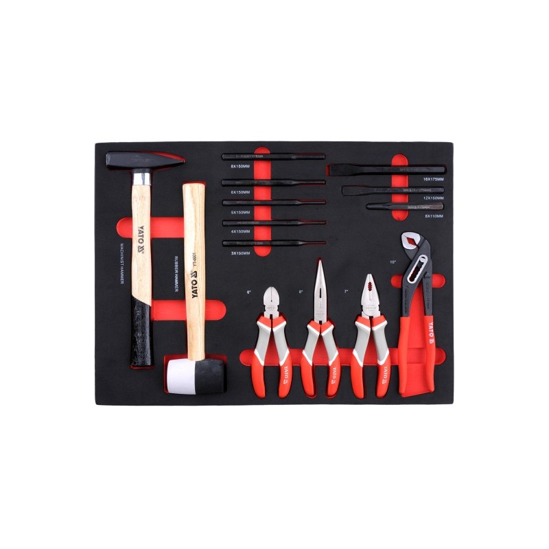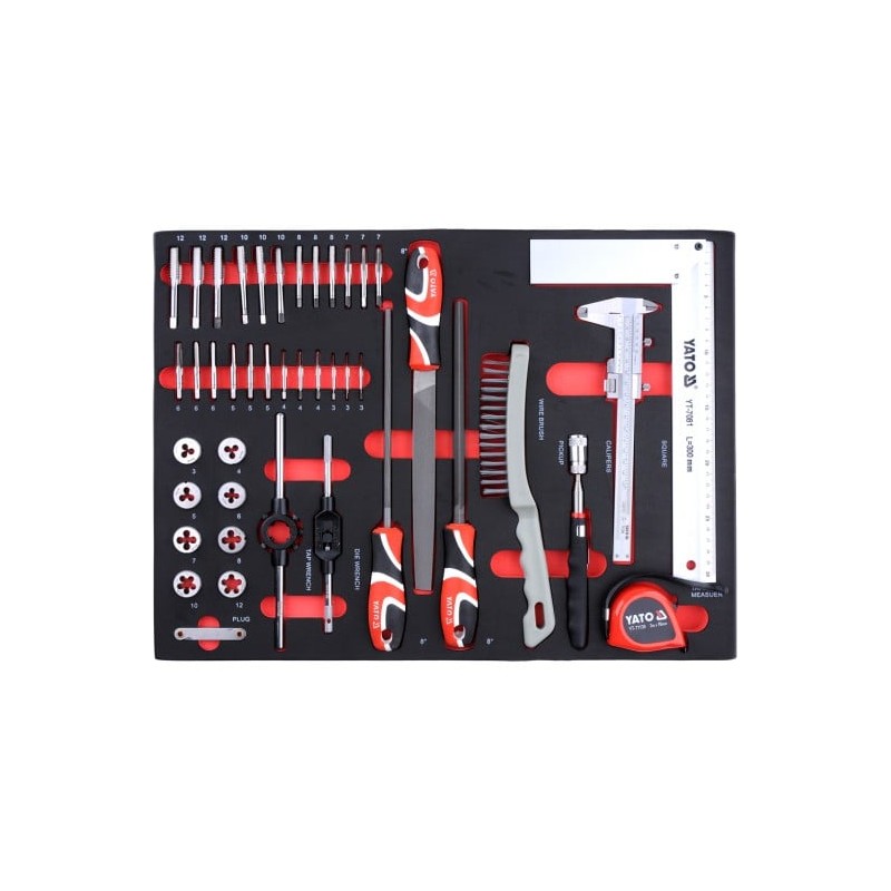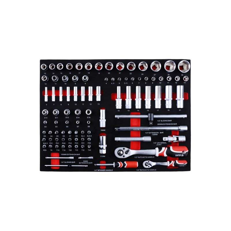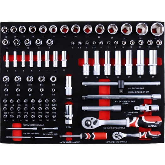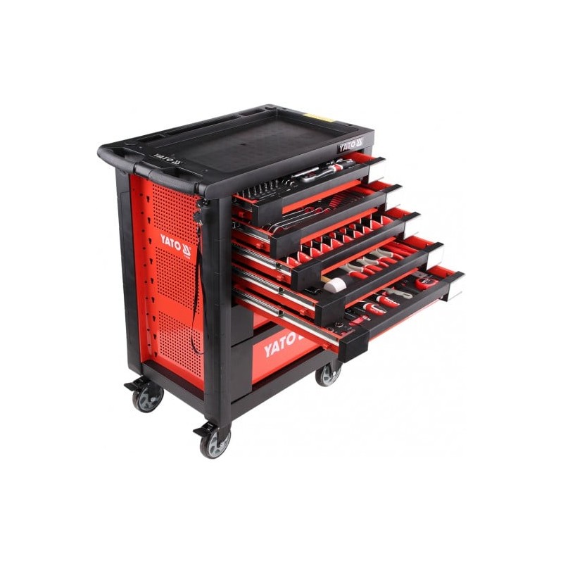 Die Werkzeugwagen von YATO sind Produkte von höchster Qualität, die auf die Bedürfnisse professioneller Kfz-Werkstätten und Mechanikerbetriebe sowie aller anderen Fahrzeugservice-Stationen zugeschnitten sind. Dank der hohen Verarbeitungsqualität erfüllen die Produkte von YATO selbst die Erwartungen der anspruchsvollsten Kunden. 5 der 7 Schubladen sind mit hochwertigen Werkzeugen bestückt, die von Spezialisten hinsichtlich ihrer Eignung und Langlebigkeit ausgewählt wurden. Das Zubehör ist vielfältig, sodass es für verschiedene Zwecke eingesetzt werden kann und in verschiedenen Bereichen des Heimwerkens eine garantiert gute Arbeitsleistung gewährleistet. Das Set enthält 201 bis 250 ordentlich angeordnete Teile, deren Qualität Sie sicherlich begeistern wird. Mit ihnen können Sie praktisch jede Reparatur durchführen.