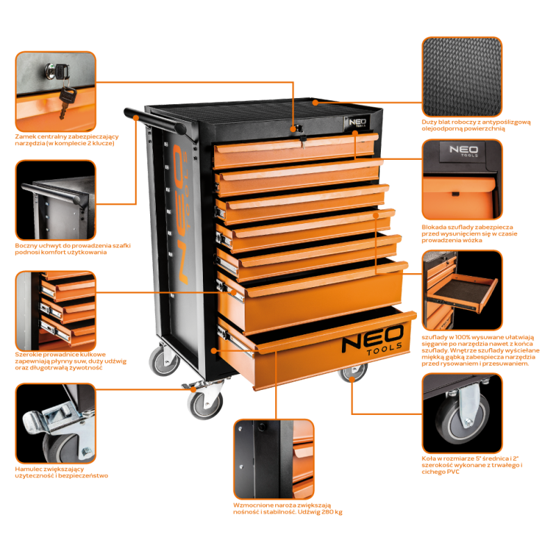 - Der Schrank verfügt über 7 praktische Schubladen für Werkzeuge, die mit einem Zentralverschluss gesichert werden