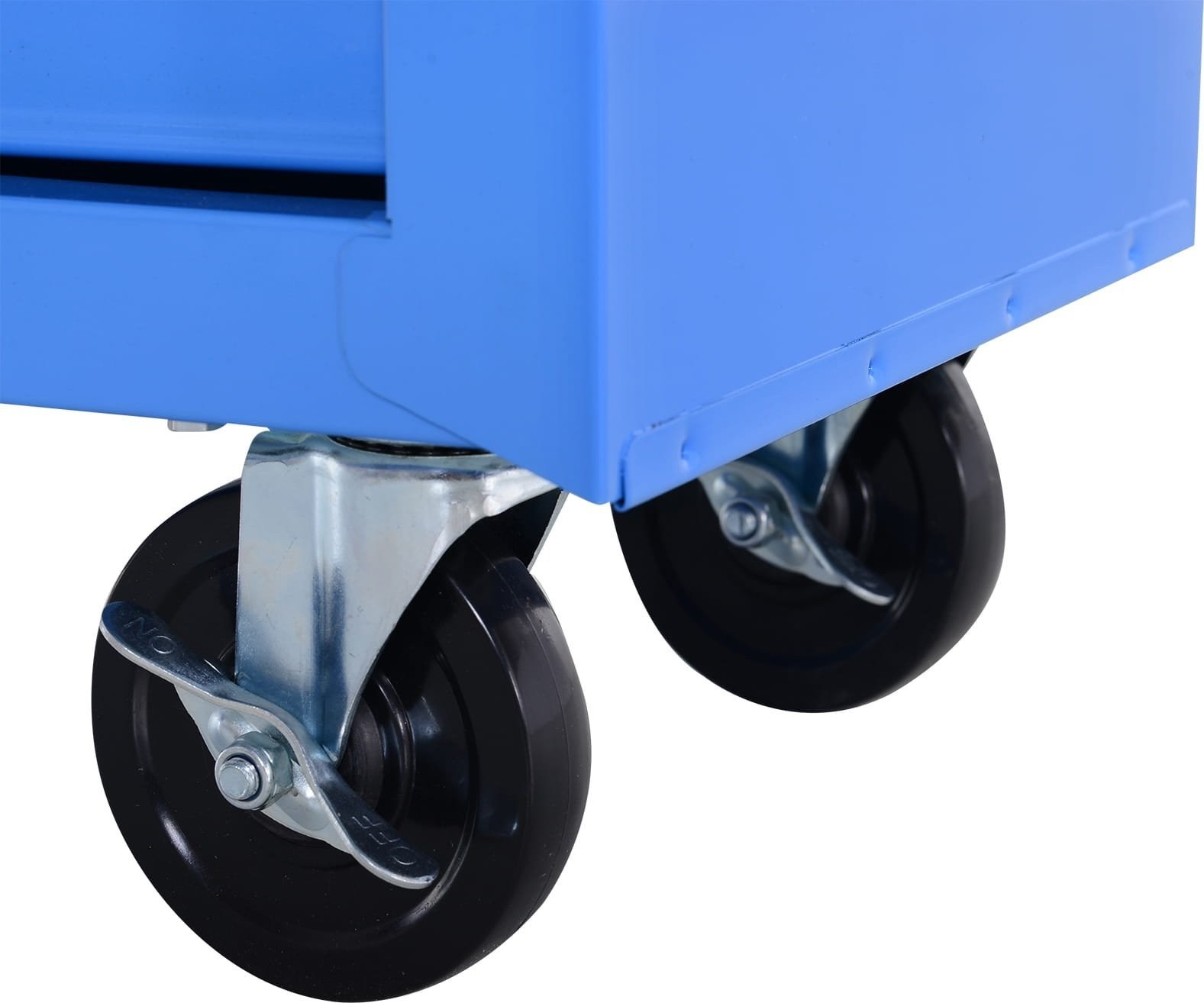Der Werkzeugwagen ist mit starren Rollen und Feststellbremsen ausgestattet, sodass er sich nicht von selbst wegbewegt