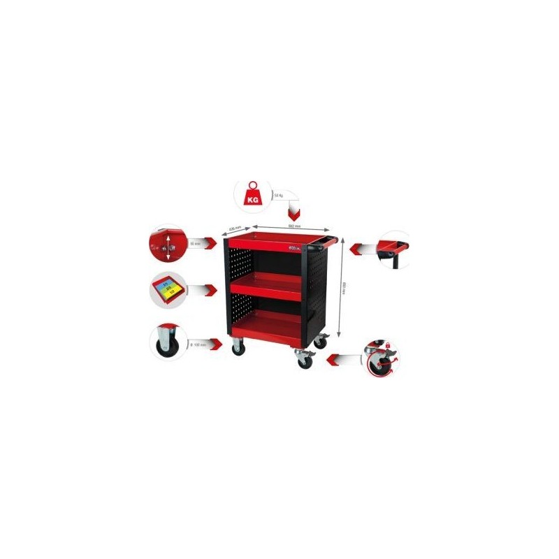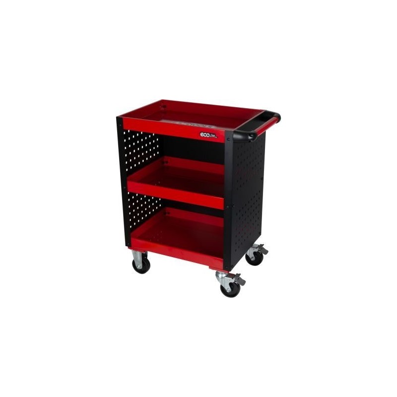 •robuste Konstruktion aus Stahlblech•leicht zu bewegen, auch bei hoher Beladung•alle Ebenen verfügen über einen hohen Rand•Innenmaße der Ladefläche: 565 x 395 mm•Seitenwand mit Aussparungen zur Aufbewahrung zusätzlicher Werkzeuge•Verschluss an der Rückwand•einfacher Zugriff auf die Werkzeuge•mit seitlichem Griff•mit 2 Rollen mit 100 mm Durchmesser•mit 2 Lenkrollen mit 100 mm Durchmesser, Rollenbremse und Schwenkfunktion•hohe Stabilität des Werkstatt-Servicewagens ECOline mit perforierten Seitenwänden