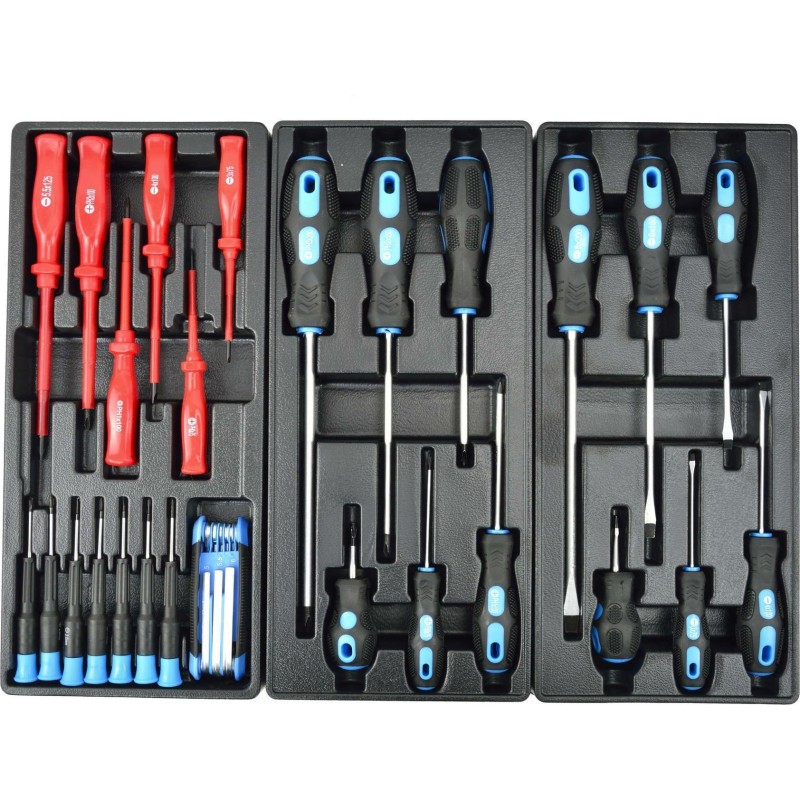 Anzahl der Teile: 245 – die Liste finden Sie weiter unten in der Beschreibung. Transportrollen: ja, mit Bremse. Abmessungen (Länge / Breite / Höhe): 90 cm / 68,5 cm / 45,5 cm. Abmessungen der Arbeitsplatte: 77 x 46 cm. Anzahl der Schubladen: 6 (4 bestückt und 2 leer). Gehäuse: Stahl, pulverbeschichtet. Zusätzliche Merkmale: Schlüsselverschluss, Schubladenführungen auf Kugellagern, zusätzlicher Tragegriff.