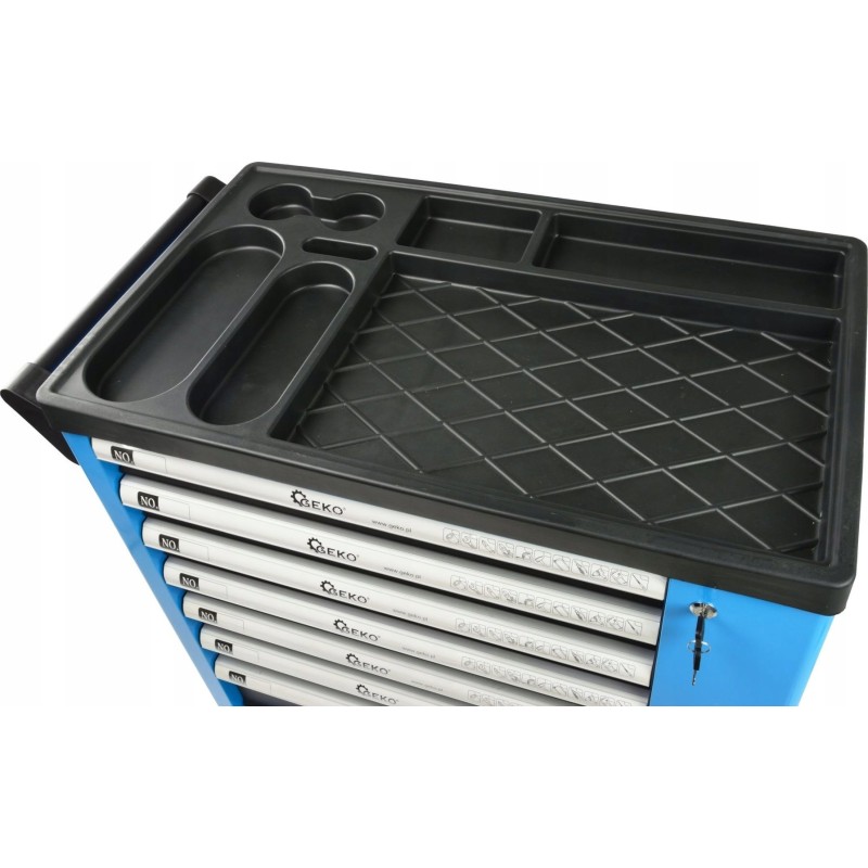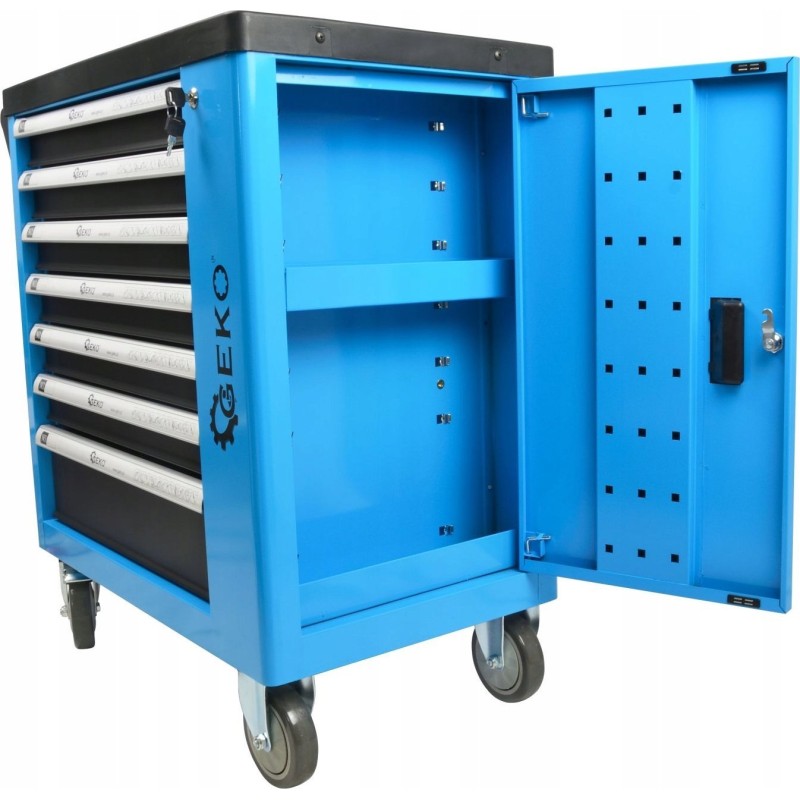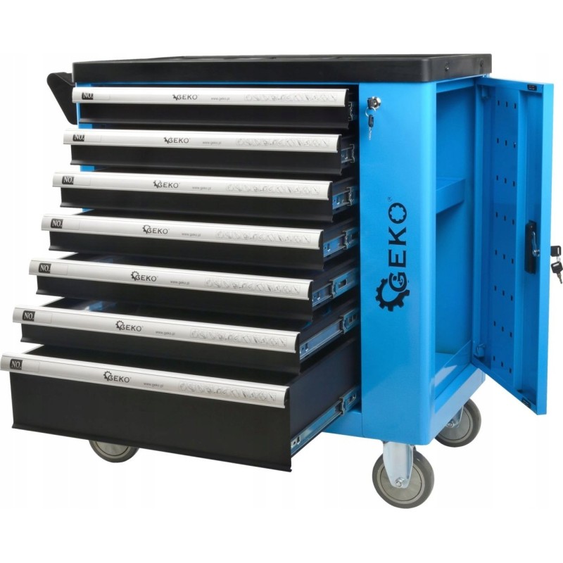 Professioneller Werkzeugschrank der bewährten Marke GEKO mit kompletter 243-teiliger Ausstattung. Der Schrank verfügt über 7 praktische, mit einem Schlüssel verschließbare Schubladen für Werkzeuge sowie ein zusätzliches, ebenfalls abschließbares Seitenfach. Alle im Set enthaltenen Elemente sind aus robusten und langlebigen Materialien gefertigt, was sie von anderen ähnlichen Sets auf dem Markt unterscheidet.
