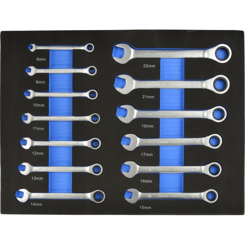 - Das Set enthält Schlüssel in den Größen: 8, 9, 10, 11, 12, 13, 14, 15, 16, 17, 19, 20, 21, 22 mm