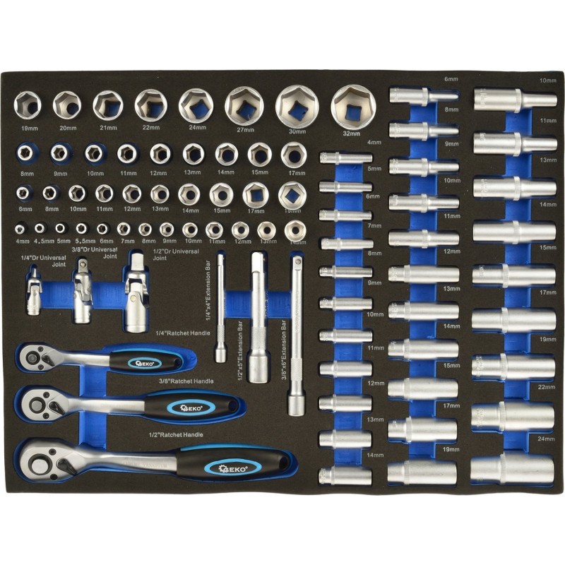 - 3/8" Standard-Sechskant-Steckschlüsseleinsätze (Länge = 26 mm): 6, 8, 10, 11, 12, 13, 14, 15, 17, 19 mm