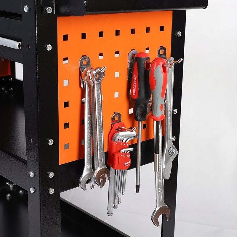 ✅ Der Korpus und die Ablagen bestehen aus robustem Stahl, was für Stabilität sorgt und eine Tragkraft von bis zu 300 kg gewährleistet. An den seitlichen Lochwänden können Haken für Werkzeuge angebracht werden. Der Korpus verfügt über einen soliden Griff, der den Transport erleichtert. Der Schrank ist mit großen, robusten Rädern aus Polypropylen ausgestattet, die sich durch eine hohe Widerstandsfähigkeit gegen mechanische Beschädigungen auszeichnen. Die eingebauten Bremsen sichern und stabilisieren den Wagen während der Arbeit. Zwei der vier Räder sind lenkbar, was für hohe Mobilität und einfache Manövrierbarkeit sorgt.