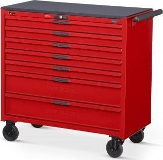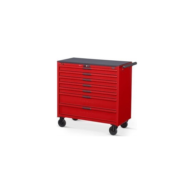 Hochwertiger Werkzeugwagen TCW207N aus rot lackiertem Stahl. Ausgestattet mit zwei feststehenden und zwei Lenkrollen (mit Bremse). Er verfügt über 7 kugelgelagerte, abschließbare Schubladen, die im Vergleich zu Standardwagen zusätzlichen Stauraum bieten. Außerdem ist ein zuverlässiges Zahlenschloss eingebaut. Jede Schublade verfügt über eine Bodenauskleidung aus Schaumgummi sowie einen Mechanismus, der verhindert, dass mehr als eine Schublade gleichzeitig herausgezogen werden kann. Der Wagen ist mit einem robusten Griff zum einfachen Transport ausgestattet. Eine Arbeitsplatte ist nicht enthalten.