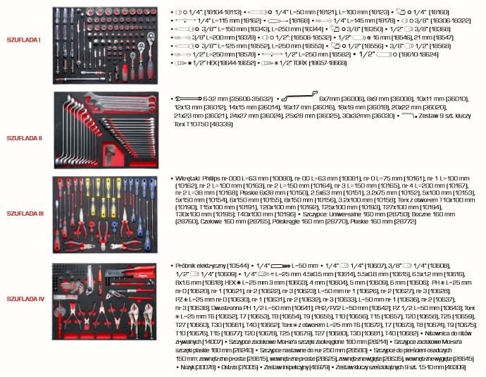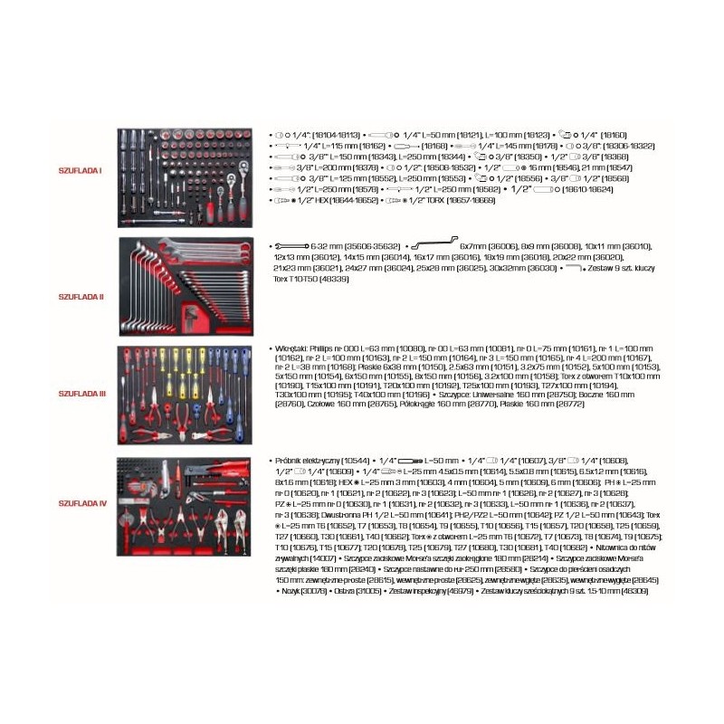- Ausstattung: 250 Stk. (Steckschlüssel, Flachschlüssel, Schraubendreher, Zangen, Nietzange, Verlängerungen, Steckschlüsseleinsätze, Bits usw.)