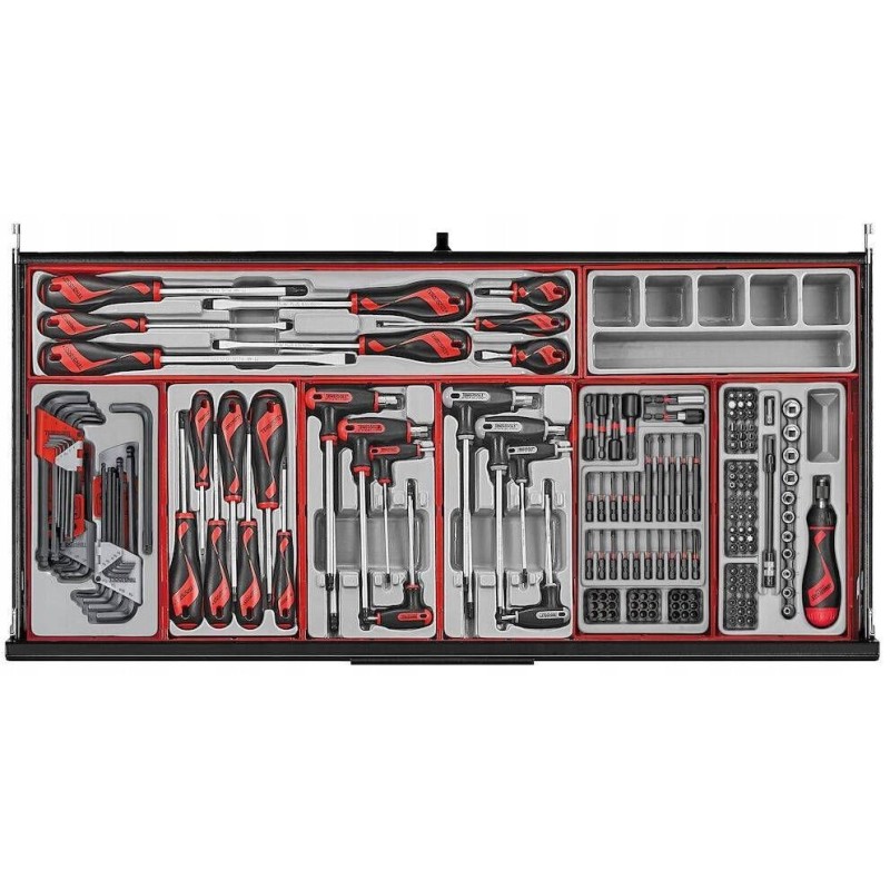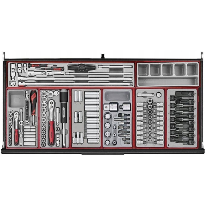 Der Wagen verfügt über acht voll ausziehbare Schubladen, die ein großes Fassungsvermögen bieten. Die Schubladen sind so konzipiert, dass sie eine Vielzahl von Werkzeugen aufnehmen können, mit einer maximalen statischen Belastung von 920 kg und einer dynamischen Belastung von 590 kg. Ergonomische Führungen sorgen für ein leichtes Öffnen und Schließen, was den Bedienkomfort erhöht.