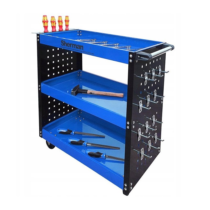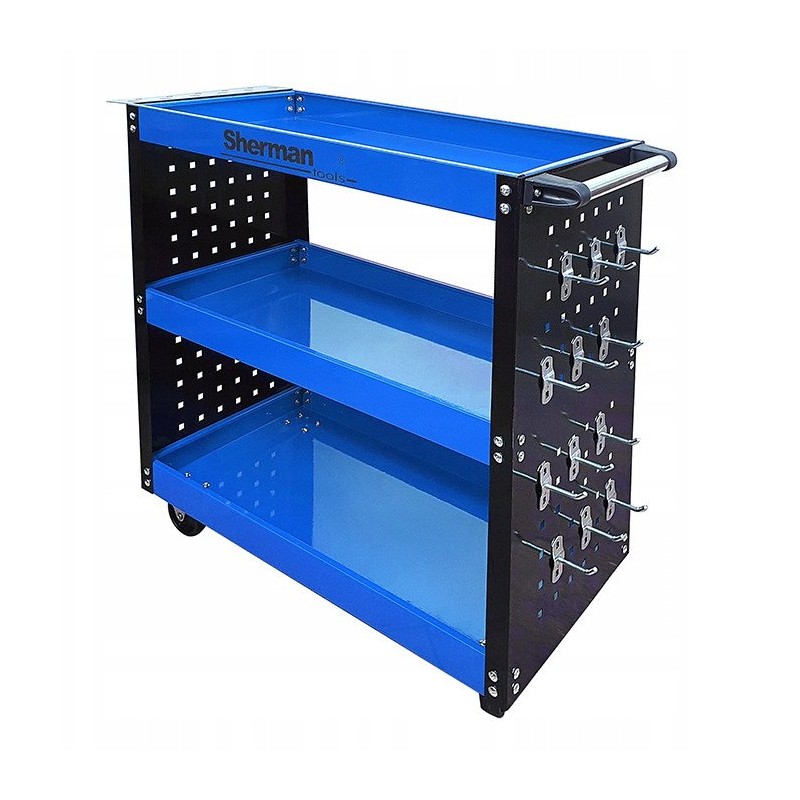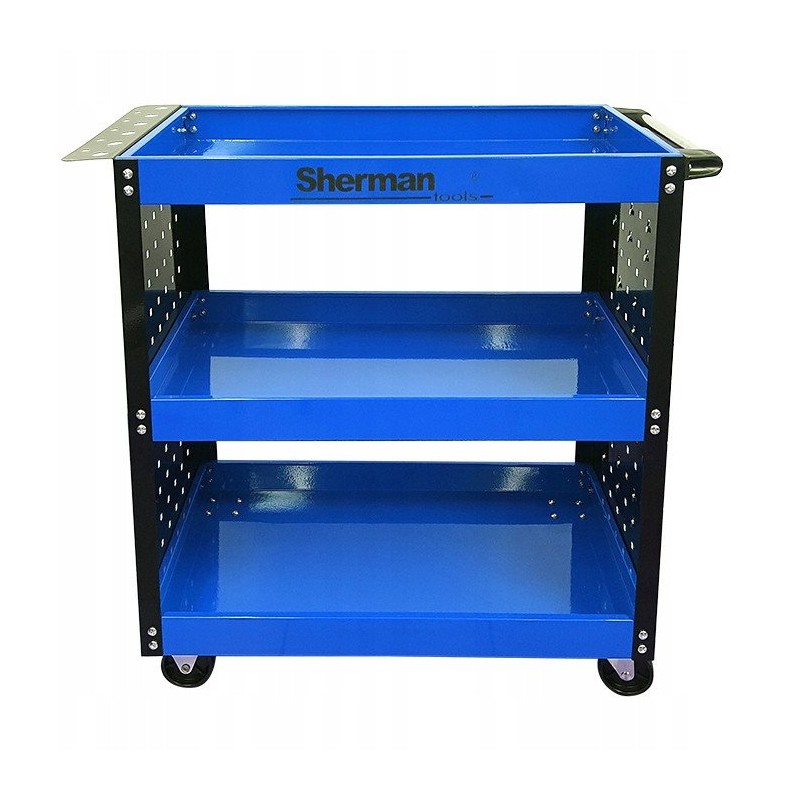 Der dreifach geteilte Werkstatt-Werkzeugwagen 3PA nb mit Sherman-Wänden ist eine hervorragende Wahl für alle, die nach einer effektiven Möglichkeit zur Aufbewahrung und zum Transport von Werkzeugen suchen. Dank der drei geräumigen Ablagen bietet der Wagen reichlich Platz für die Organisation von Werkzeugen, was ihn zur idealen Lösung für Werkstätten und Servicebetriebe macht.