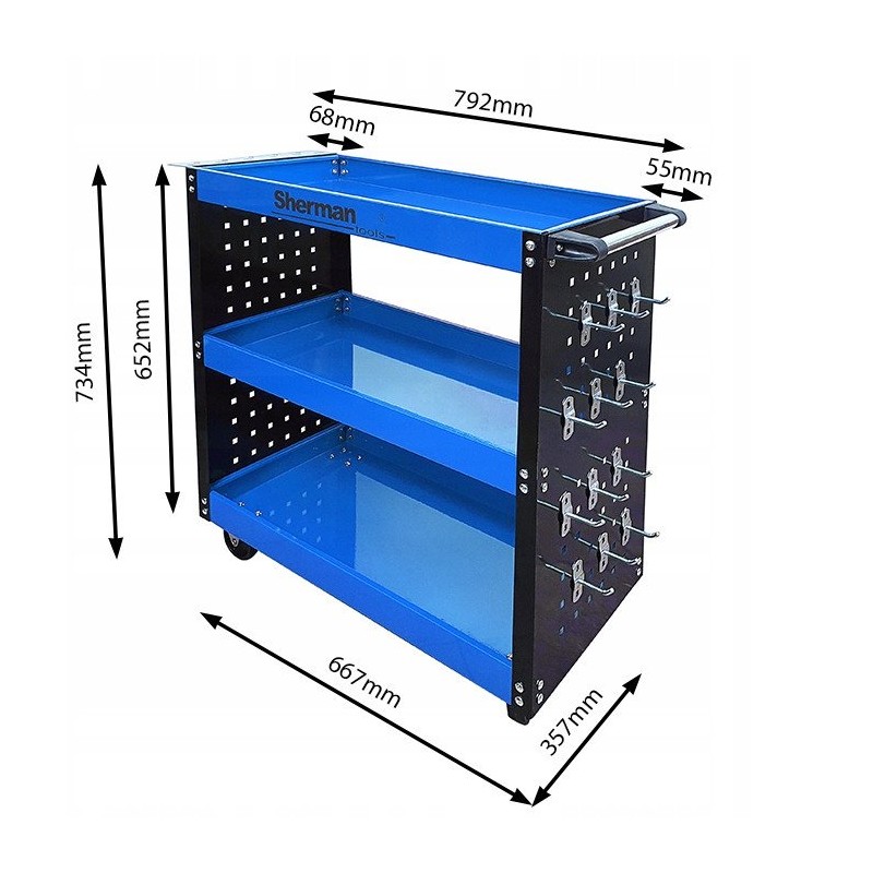 Der Wagen hat Außenmaße von 76,5 cm Höhe, 80 cm Breite und 35 cm Tiefe. Der Abstand zwischen den Regalböden beträgt 25 cm, und die Abmessungen eines einzelnen Regalbodens betragen 66,5 cm Länge, 35 cm Breite und 5,5 cm Tiefe. Die Tragkraft des Wagens beträgt 100 kg, wodurch er sich für die Aufbewahrung größerer Werkzeuge eignet.