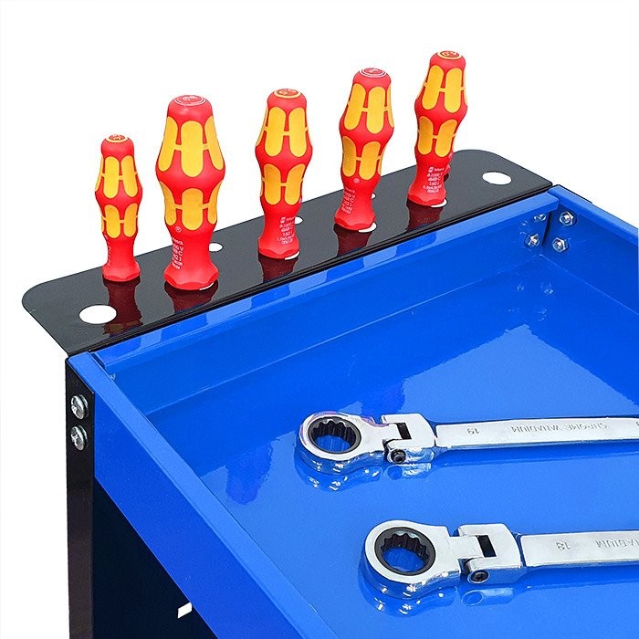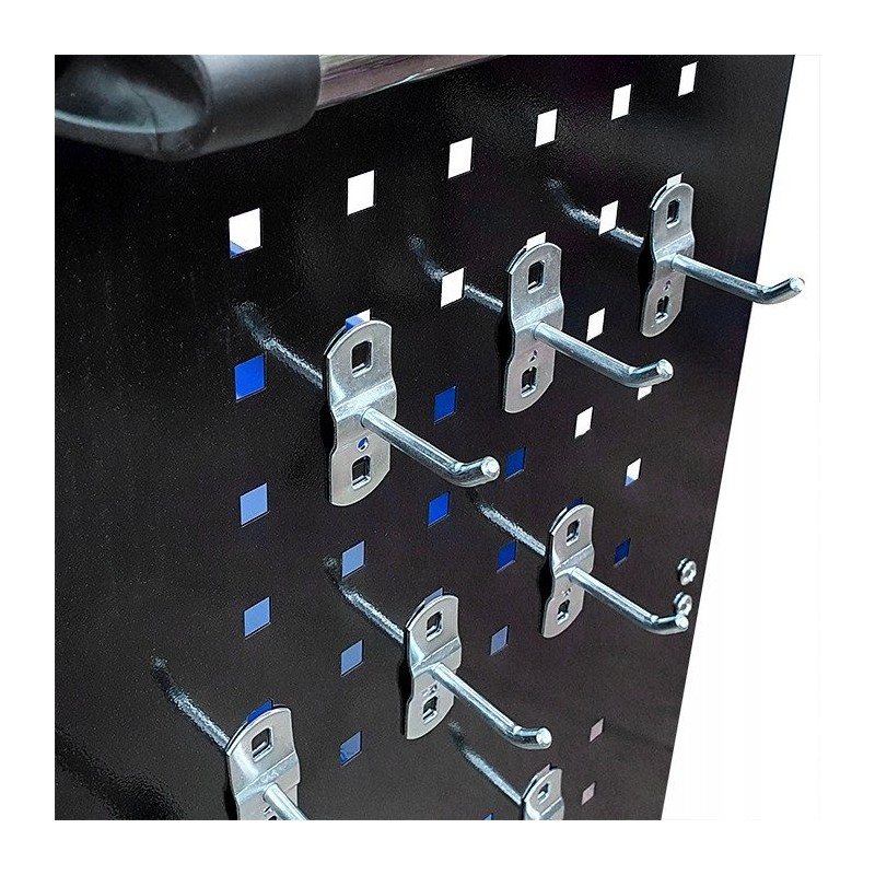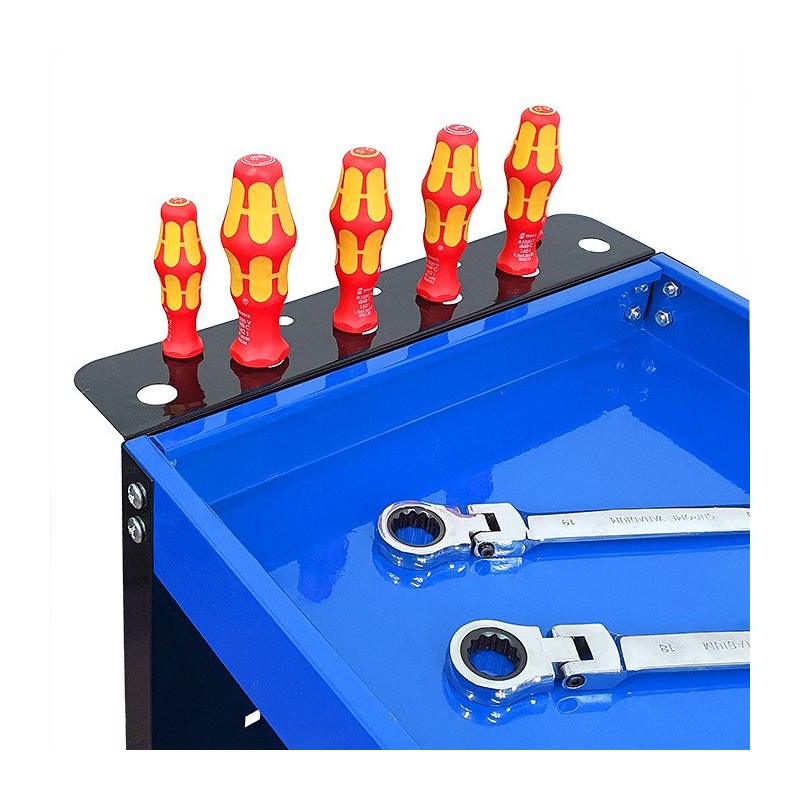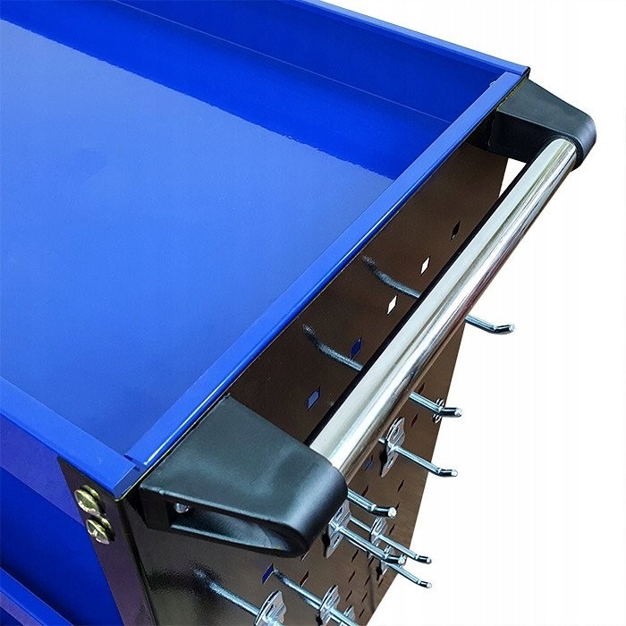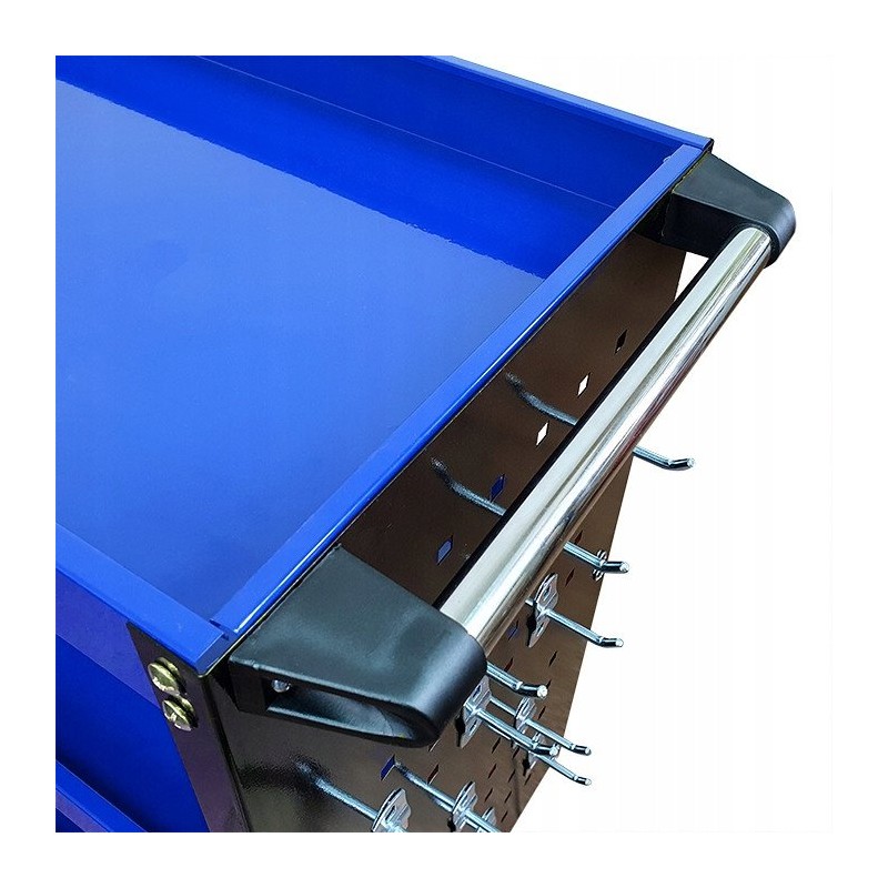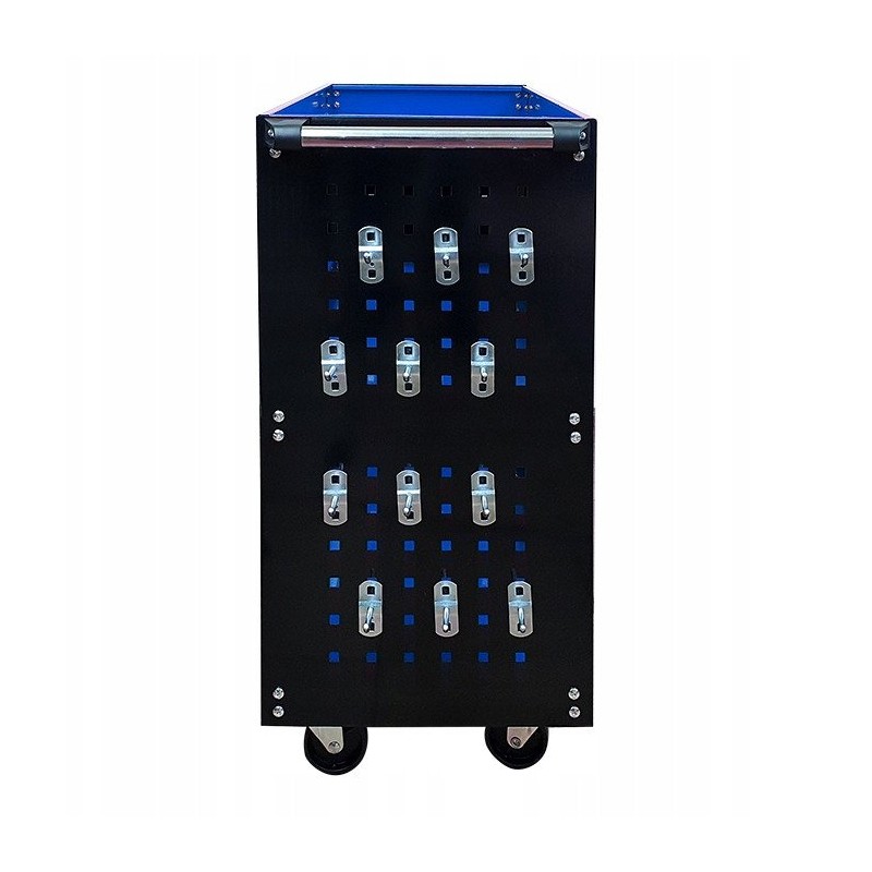 Der Wagen ist mit einem praktischen Halter für Schraubendreher sowie Seitenwänden mit 12 Haken ausgestattet, was seine Funktionalität erheblich erhöht. Dadurch sind alle notwendigen Werkzeuge immer griffbereit, was die Arbeit und die Organisation in der Werkstatt erleichtert.
