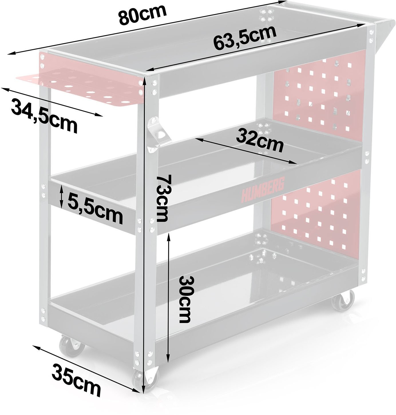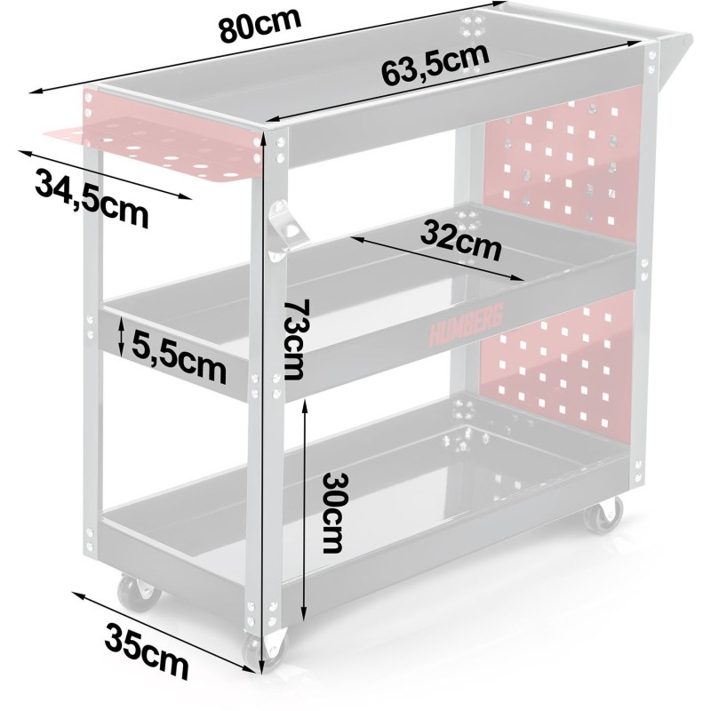 - 3 große Plattformen aus hochwertigem, profiliertem Stahlblech sorgen für Stabilität und viel Platz zur bequemen Aufbewahrung und zum Transport von Werkzeugen und Zubehör.