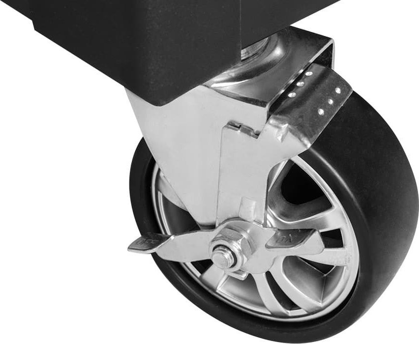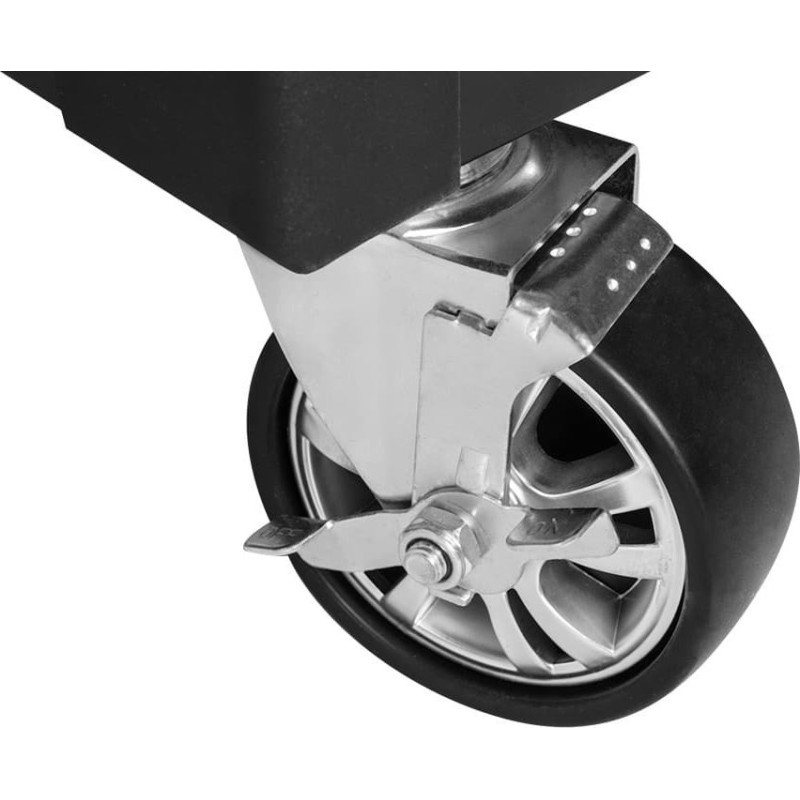Die daran befestigten 5-Zoll-PU-Rollen sind mit einer Bremse ausgestattet und ermöglichen das Verschieben des Schranks im Werkstattbereich. Dies wird zusätzlich durch den angebrachten Schiebegriff erleichtert.