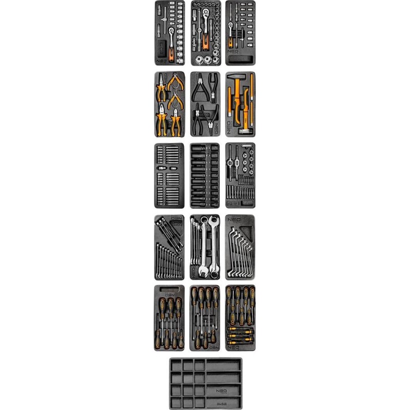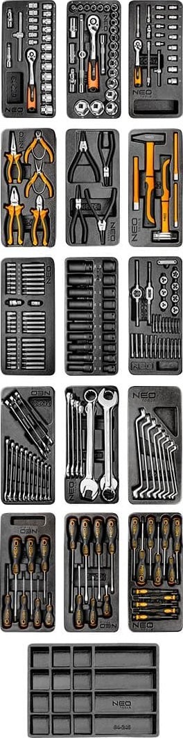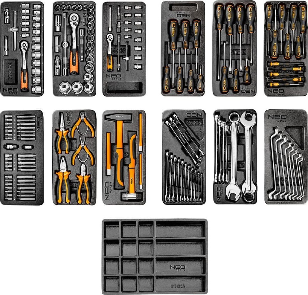 Der vielseitige Werkzeugschrank der Marke NEO wird mit einem umfassenden Set aus 174 Teilen angeboten und wird jeden Profi und Heimwerker begeistern! Er bietet robusten Stauraum und ermöglicht den teilweisen Transport Ihrer Werkzeugsammlung. Er zeichnet sich durch außergewöhnliche Robustheit, sieben Schubladen und praktische Funktionen für den täglichen Gebrauch aus.