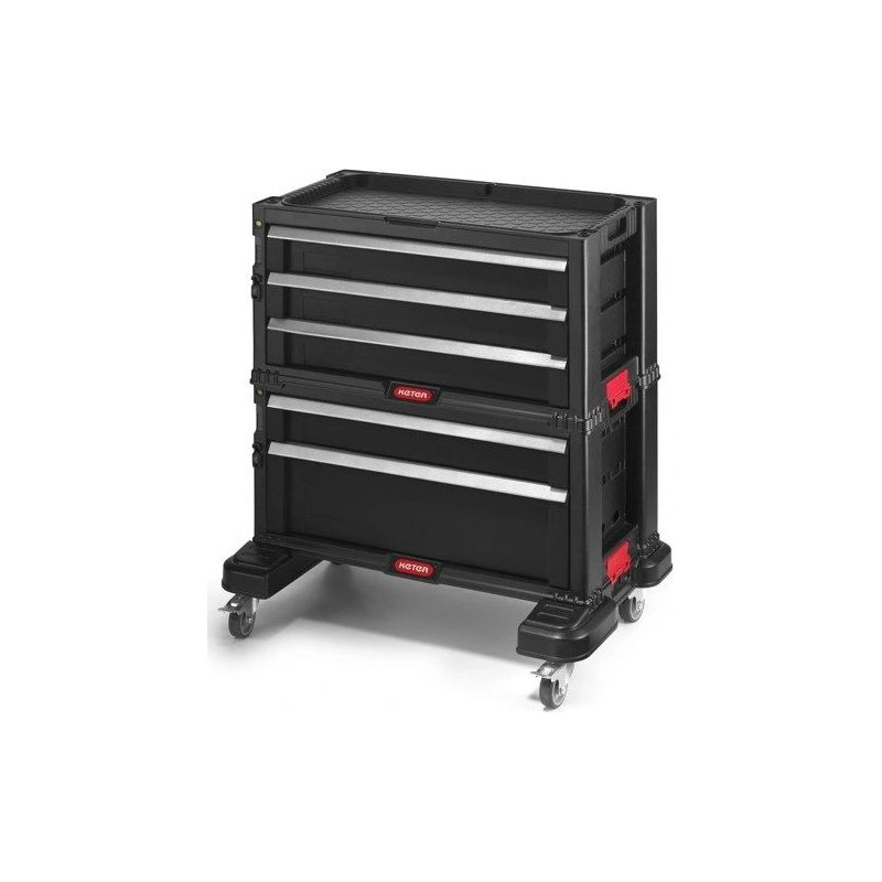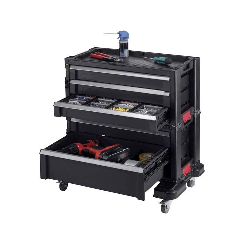 5-Schubladen-Kasten auf Lenkrollen – enthält eine tiefe Schublade mit herausnehmbaren Trennwänden für größere und schwerere Werkzeuge. Die weiteren 4 Schubladen für kleinere Werkzeuge und Zubehör umfassen 16 herausnehmbare Werkzeugkästen, die für die Aufbewahrung von kleinerem KETER-Zubehör höchster Qualität vorgesehen sind.