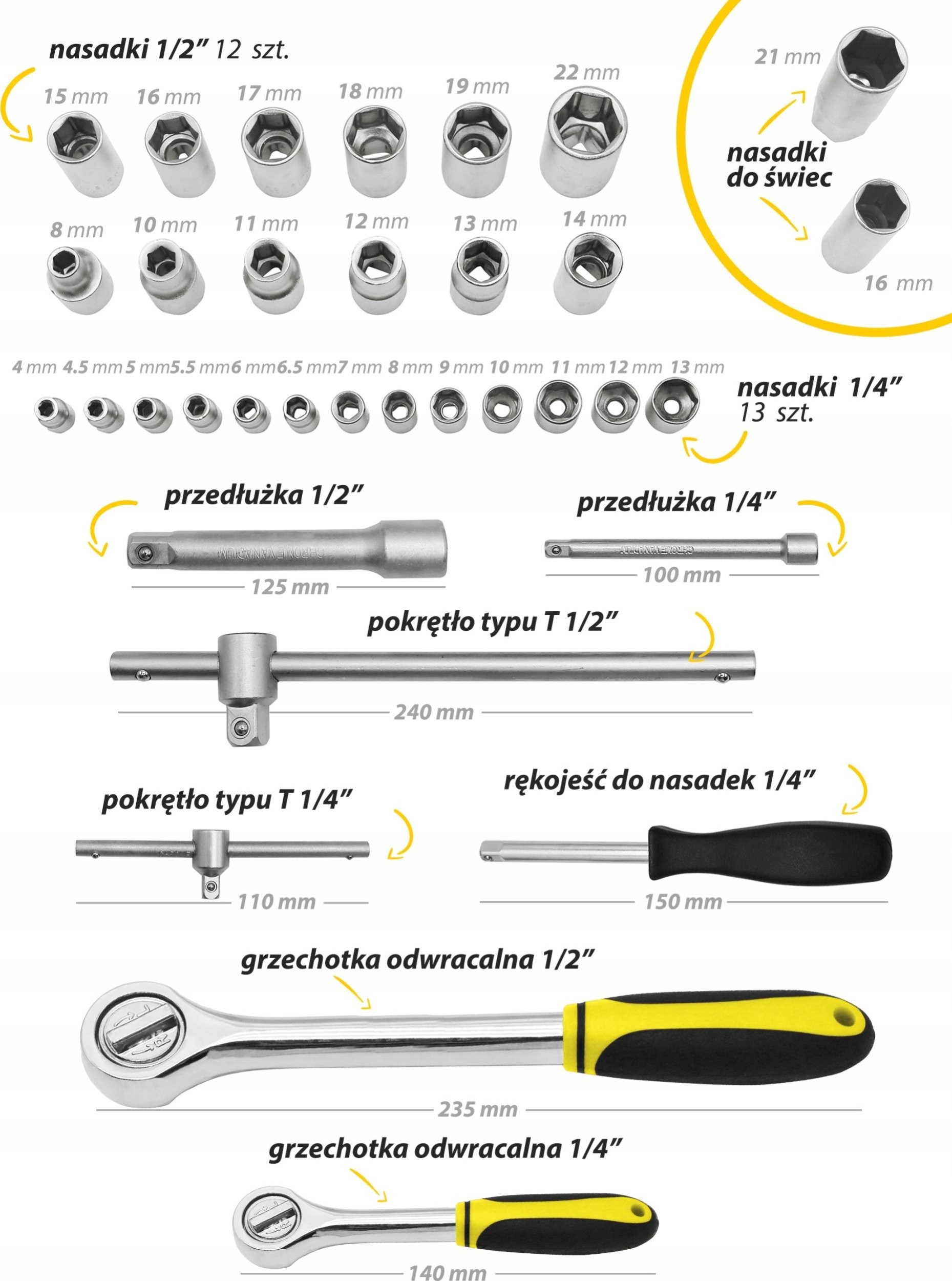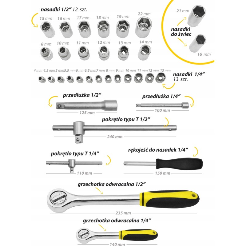 - Steckschlüsseleinsätze 1/4" – 13 Stück: 4 mm, 4,5 mm, 5 mm, 5,5 mm, 6 mm, 6,5 mm, 7 mm, 8 mm, 9 mm, 10 mm, 11 mm, 12 mm, 13 mm
