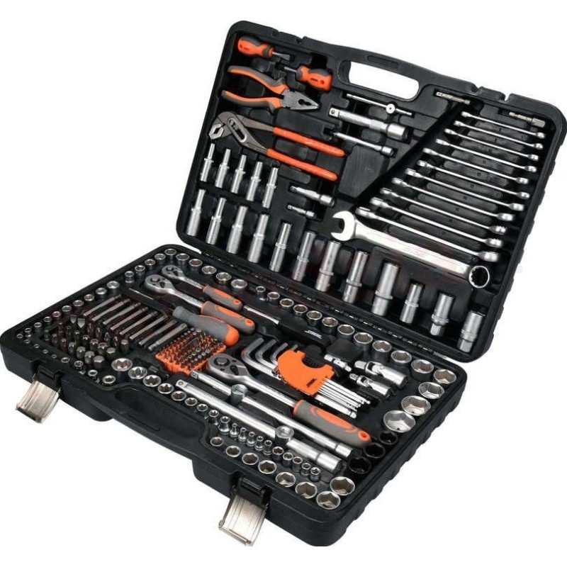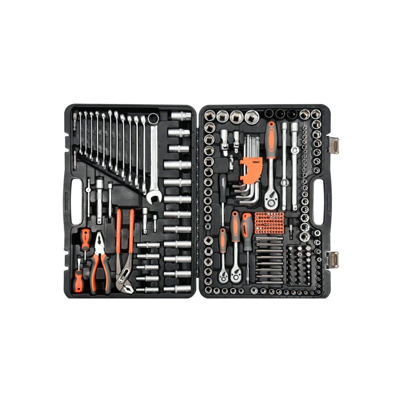Der STHOR-Werkzeugsatz besteht aus 225 Teilen, die in einem praktischen Kunststoffkoffer untergebracht sind. Die Werkzeuge wurden präzise aus Materialien gefertigt, die ihre Zuverlässigkeit gewährleisten. Das Set enthält eine vollständige Auswahl an 1/4"-, 1/2"- und 3/8"-Steckschlüsseleinsätzen, Verlängerungen, Kardanwellen und vielen weiteren Teilen, darunter auch Ratschen mit 45 Zähnen. Dank dieser Zusammenstellung eignet sich das Set für kleinere Montagearbeiten, mechanische Reparaturen und viele andere Arbeiten im Haushalt oder in der Werkstatt.