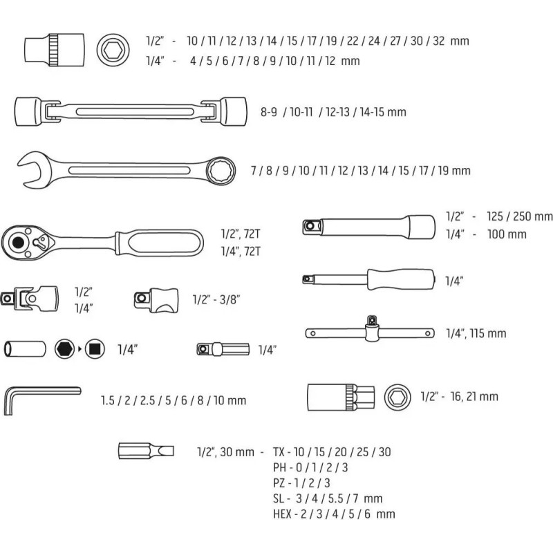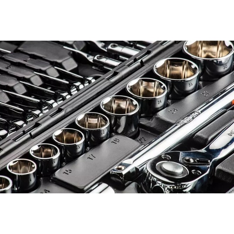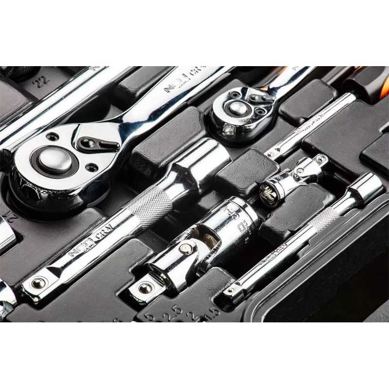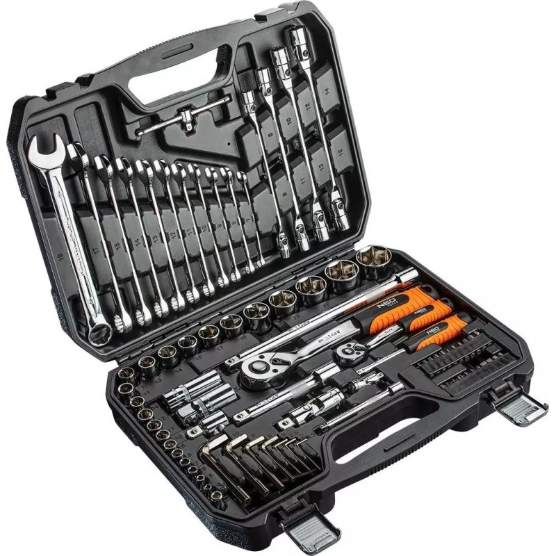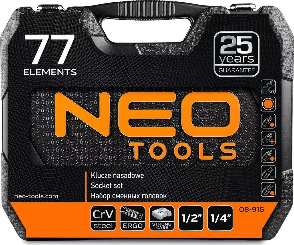 Das Steckschlüsselset 1/4", 1/2" von NEO ist das ideale Steckschlüsselset für mechanische Anwendungen. 77 Teile sind ausreichend, um zahlreiche Anwendungsmöglichkeiten für dieses Set zu finden. Zwei Größen von Ratschen und Zubehör bieten uns vielfältige Einsatzmöglichkeiten. Die Größe 1/2" ermöglicht den Einsatz großer Kräfte; bei festsitzenden Schrauben können wir nicht nur mit der Ratsche selbst, sondern auch mit einem aus einem Adapter gefertigten Drehknopf arbeiten. Die Größe 1/4" ermöglicht den Einsatz dort, wo sonst nichts passt. Jede Größe enthält im Set eine präzise Ratsche mit 72 Zähnen (5°-Rastung), einen Satz Sechskantsteckschlüsseleinsätze, Verlängerungen und Gelenke – das ist die Basis. Was bei diesem Set besonders hervorzuheben ist: - Zündkerzensteckschlüssel + Gelenke + Verlängerungen + Ratschen = Möglichkeit, Zündkerzen zu lösen, selbst solche, die tief im nach hinten geneigten Motorblock sitzen; - der 1/4-Zoll-Schraubendreher sieht zwar schlicht aus, verfügt aber im Griff über eine zusätzliche 1/4-Zoll-Aufnahme, wodurch er als Verlängerung mit zusätzlichem Griff für präzise Führung verwendet werden kann. Wenn wir dazu noch einen Bitsatz mit Adapter sowie eine Auswahl an 1/4“-Steckschlüsseleinsätzen und einen T-Griff hinzufügen, lässt sich praktisch alles lösen; - Eine hervorragende Ergänzung sind Flachring-Schraubenschlüssel, die sich nicht nur zum Lösen und Anziehen von Schrauben eignen, sondern auch hervorragend als Unterstützung bei der Arbeit mit einer Ratsche dienen, um die Schraube oder Mutter auf der anderen Seite der Verbindung festzuhalten; - Gelenkschlüssel – zum schnellen Lösen von Schrauben, ohne den Schlüssel von der Schraube abnehmen zu müssen, sowie als Unterstützung bei der Arbeit mit der Ratsche; - Die Anzahl der Elemente ermöglicht Tausende von Kombinationen, und praktisch nur die Vorstellungskraft setzt den Möglichkeiten Grenzen. Alle Steckschlüsseleinsätze, Ratschen und Schraubenschlüssel sind aus hochfestem Chrom-Vanadium-Stahl (Cr-V) gefertigt. Alle Schraubendreherbits sind aus S2-Werkzeugstahl gefertigt. Das Ganze befindet sich in einem passend angepassten, robusten Koffer mit Metallverschlüssen. 25 Jahre Garantie sind ein Beweis für die Zuverlässigkeit und Solidität der Teile.