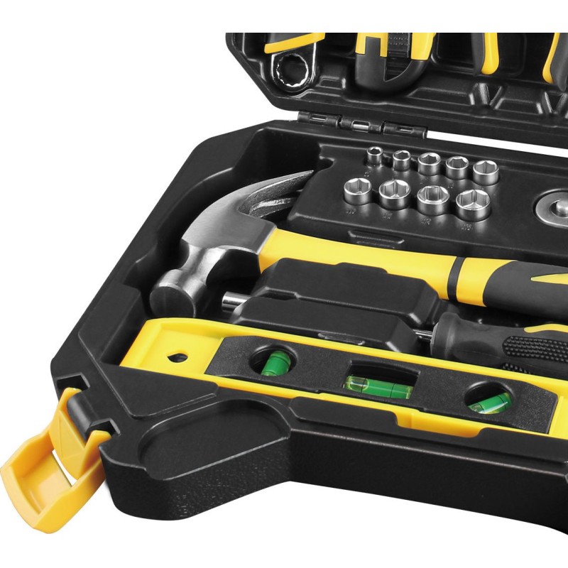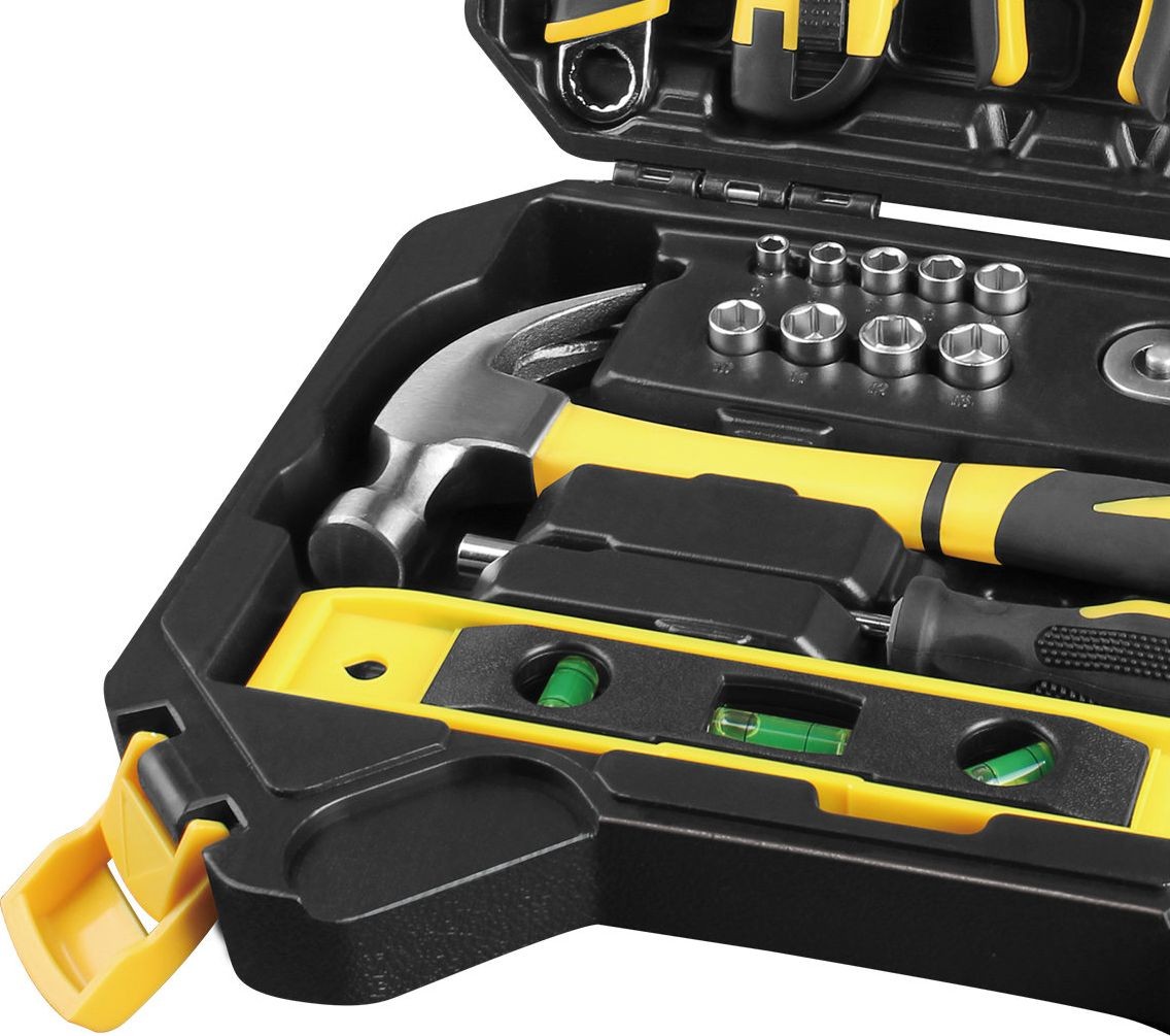 Werkzeugset bestehend aus 60 Teilen, einschließlich eines 1/4"-Ratschen-Schlüssels und Steckschlüsseleinsätzen von 5 bis 13 mm in CR-V-Qualität. Im Set enthalten sind außerdem eine Seitenschneidezange, eine Drahtzange, ein Hammer, eine Wasserwaage, Inbusschlüssel, ein Schraubendreher sowie ein Bitsatz. Außerdem finden Sie hier einen Universal-Steckschlüssel, ein Messer und ein Maßband. All dies in einem Kunststoffkoffer mit ergonomischem Griff, dessen Anordnung es ermöglicht, den Koffer nur von der richtigen Seite zu öffnen, sodass die Werkzeuge beim Öffnen nicht herausfallen.