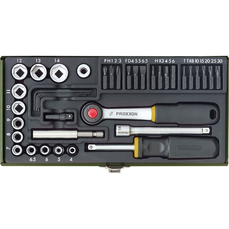 39-teiliges Set professioneller PROXXON-Schraubendreher mit Magnethalterung. Enthält Steckschlüsseleinsätze (1/4" = 6,3 mm) in den Größen 4 – 14 mm, zusätzlich 16 Bits aus Spezialstahl, 1 Adapter für die Verbindung Sechskant/Vierkant (Magnethalter/Steckschlüsseleinsatz) und 1 Adapter (Inbus/Vierkant) für die Verbindung Ratsche/Bit. Abgewinkelte Inbusschlüssel 1,25 – 1,5 – 2 – 2,5 und 3 mm. Die übrigen Teile sind auf dem Foto zu sehen.